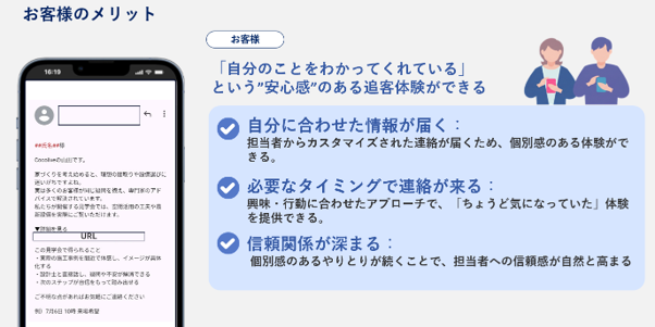 顧客の興味・行動データをAIがリアルタイムで自動学習し、完全個別・高精度な追客文章をワンクリックで生成し、「この担当者は、自分のことをわかってくれている」と顧客に感じてもらえる追客を、住宅・不動産営業の新しいスタンダードとして提供します。