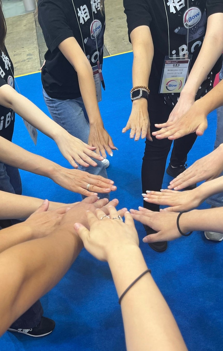 初日の朝一番、ブースではスタッフ全員がお揃いのiBow Tシャツ(黒)を着用し、円陣を組んで「オー!!」