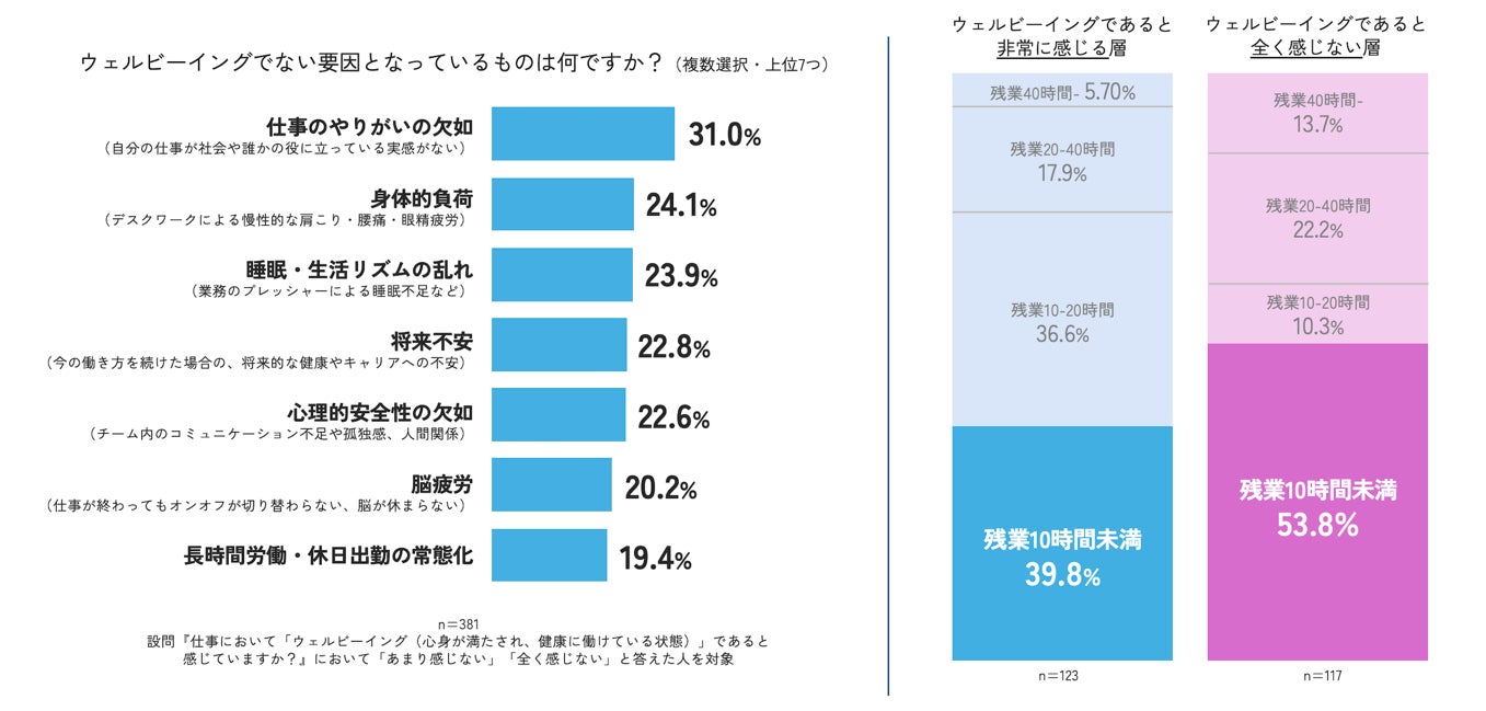 ウェルビーイングであると感じていない層の約4割が「残業10時間未満」と回答。残業の少なさがウェルビーイングの向上に直結しているわけではないことがうかがえる。ウェルビーイングであると感じられない一番の要因は「やりがいの欠如」(31.0%)で、高年齢層になるほどその割合が高まるという結果に。