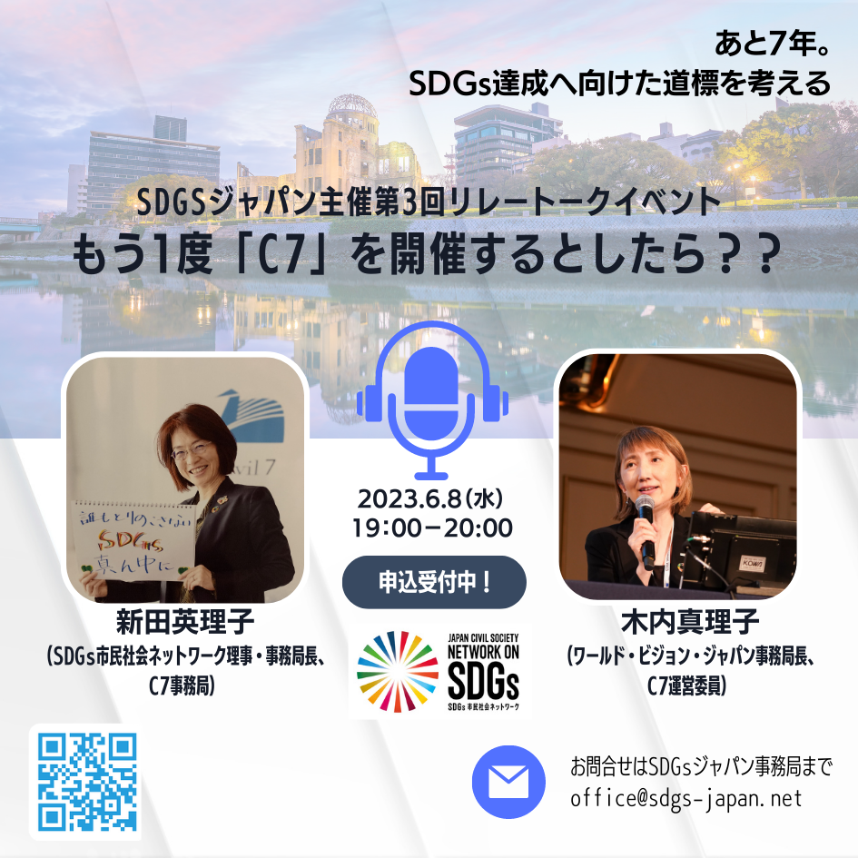第3回は、SDGsジャパン理事・事務局長の新田英理子が、Civil7の理事メンバーで共同代表も務めた木内真理子さん(特定非営利活動法人ワールド・ビジョン・ジャパン事務局長)とともに、「G7」の日本開催を公式エンゲージメントグループCivil7(以下、C7)の立場からC7のあり様を考えます。