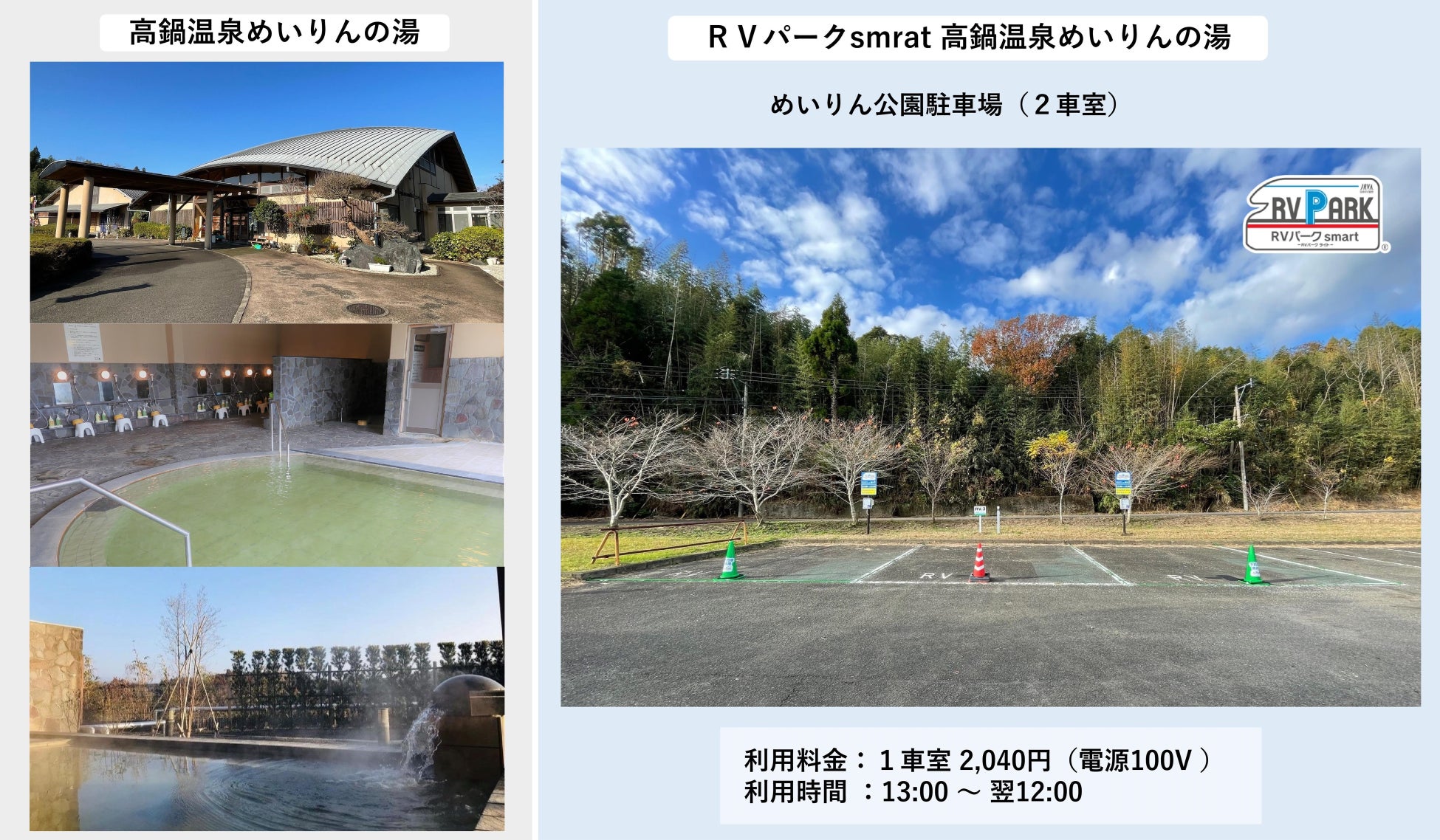 RVパークsmart高鍋温泉めいりんの湯:https://rvparksmart.jp/rv-smart/meirinspa.html