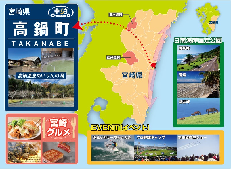 九州周遊観光活性化コンソーシアム(代表機関:トラストパーク株式会社 本社:福岡県福岡市博多区、代表取締役:山川 修)は、通過型地域などの観光振興を目的として広域に展開している車泊(くるまはく)・RVパークsmartを宮崎県の高鍋町「高鍋温泉めいりんの湯」に開設し、2023年12月16日より車泊予約を開始しました(車泊事業モデルは下部※①参照)。