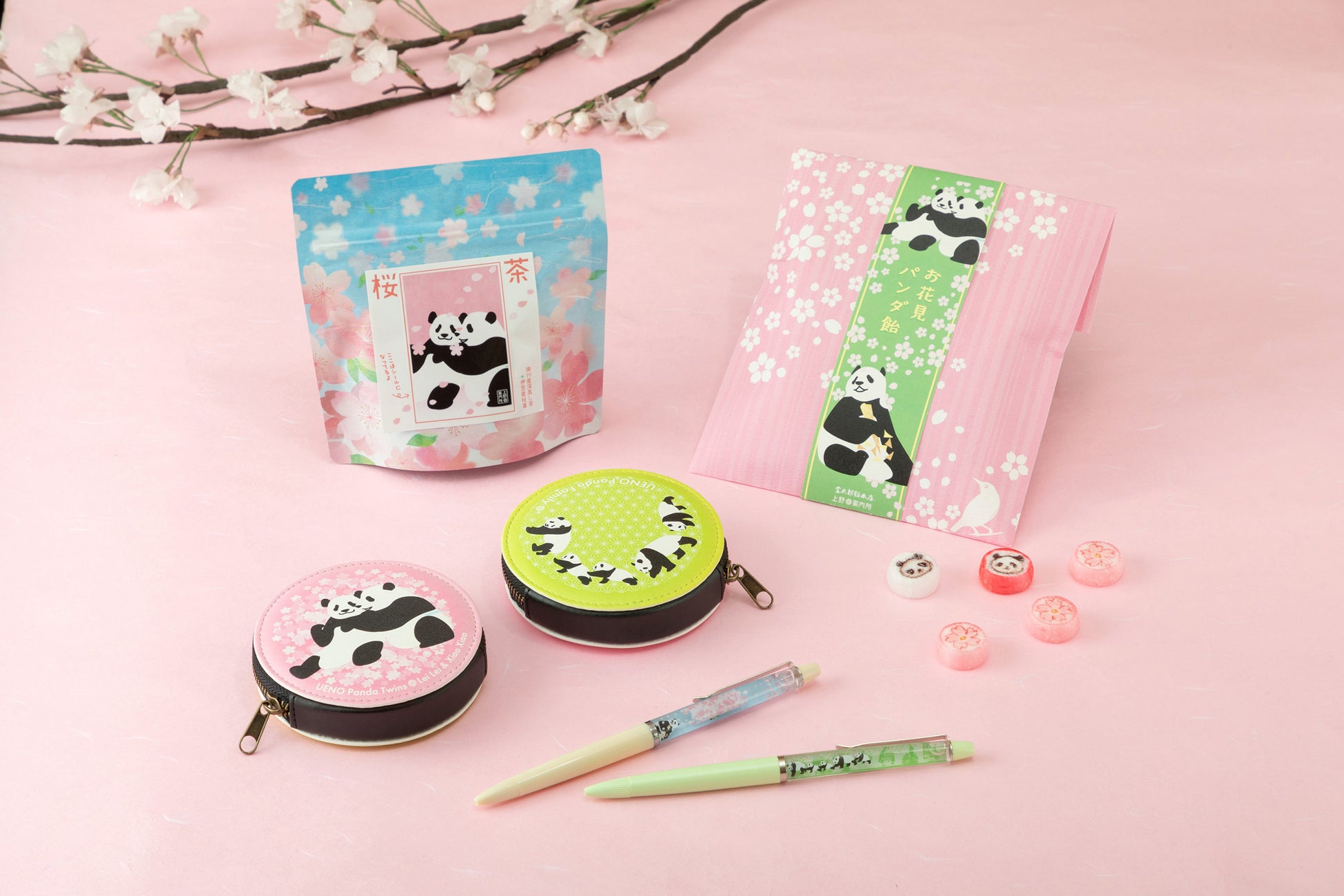 お花見やお散歩をテーマに、両面にイラストの入ったコインケースやフローティングペン、また毎年人気の『パンダ桜茶』と『お花見パンダ飴』も新パッケージで登場します!