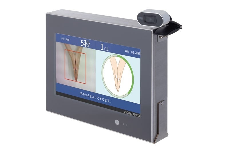 新製品は、厚生労働省が推奨する食品衛生の手洗い6ステップの正しさをAI技術で自動判定するシステム機器です。