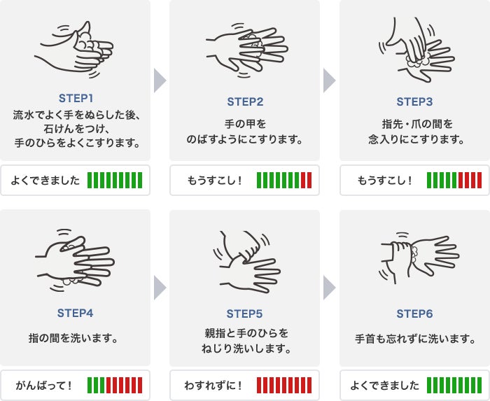 新製品は、トレーニングモードで手洗い6ステップを練習することができます。
