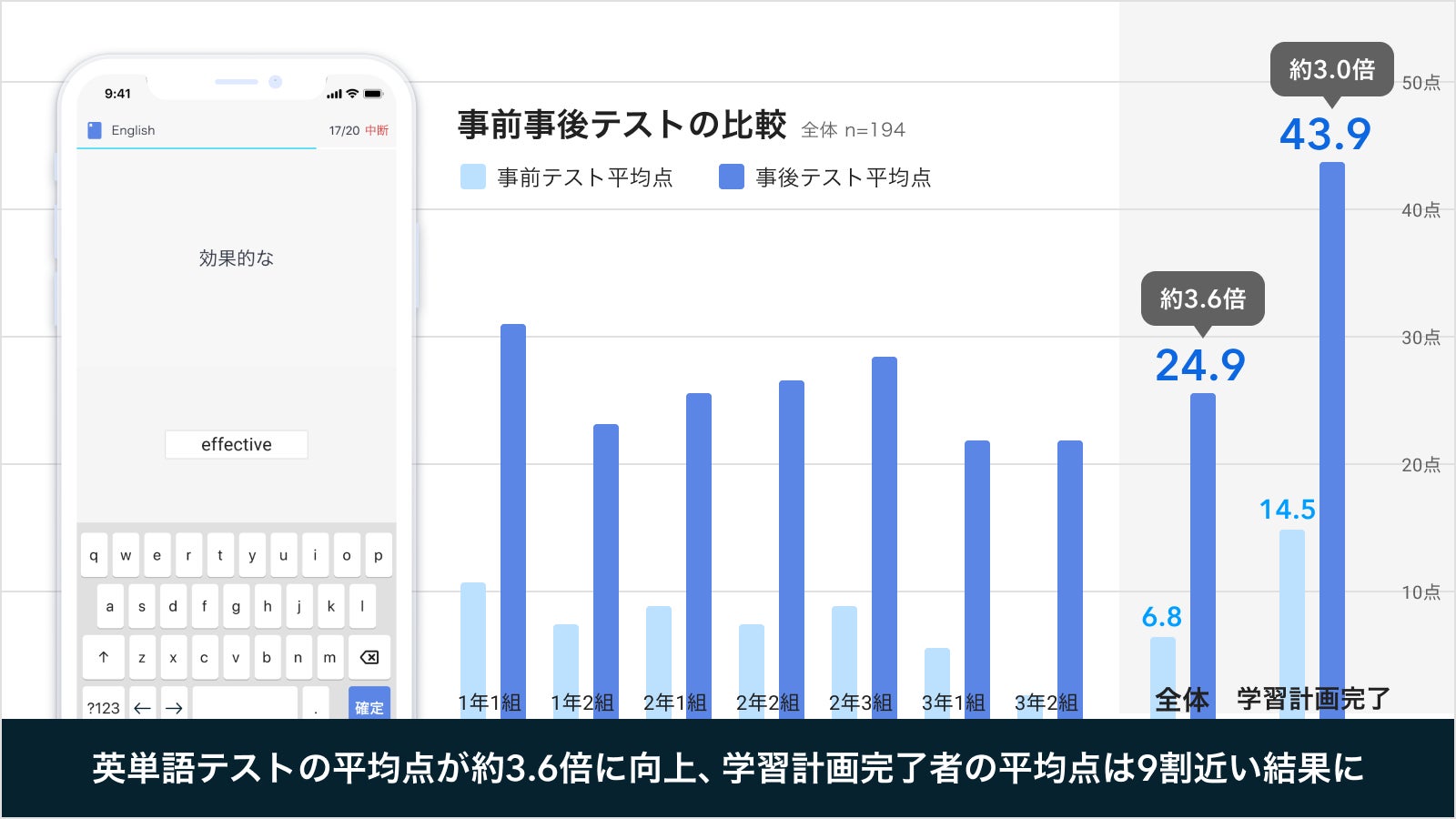 墨田区立錦糸中学校の実証事業で「Monoxer(モノグサ)」活用後、生徒194名の英単語テストの平均点が約3.6倍に上昇