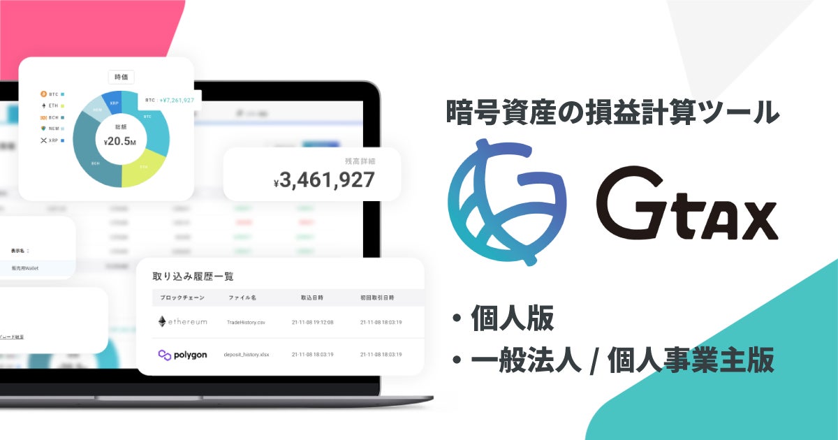 「Gtax」シリーズは、暗号資産を始めとするデジタルアセットの損益計算ツールです。主に個人でデジタルアセットの取引を行う方の確定申告や日々の損益計算をサポートします。