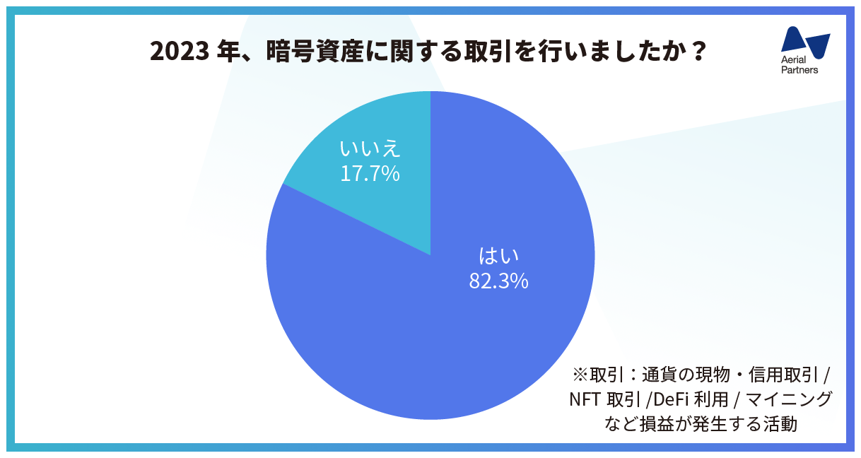 ここ数年の中では比較的大幅な価格の上昇場面もあった2023年ですが、暗号資産の損益計算ツール「Gtax」のご利用者様を対象に実施した本アンケートでは、「2023年、暗号資産に関する取引を行いましたか?」という設問に対し、約8割が「はい」と回答しました。