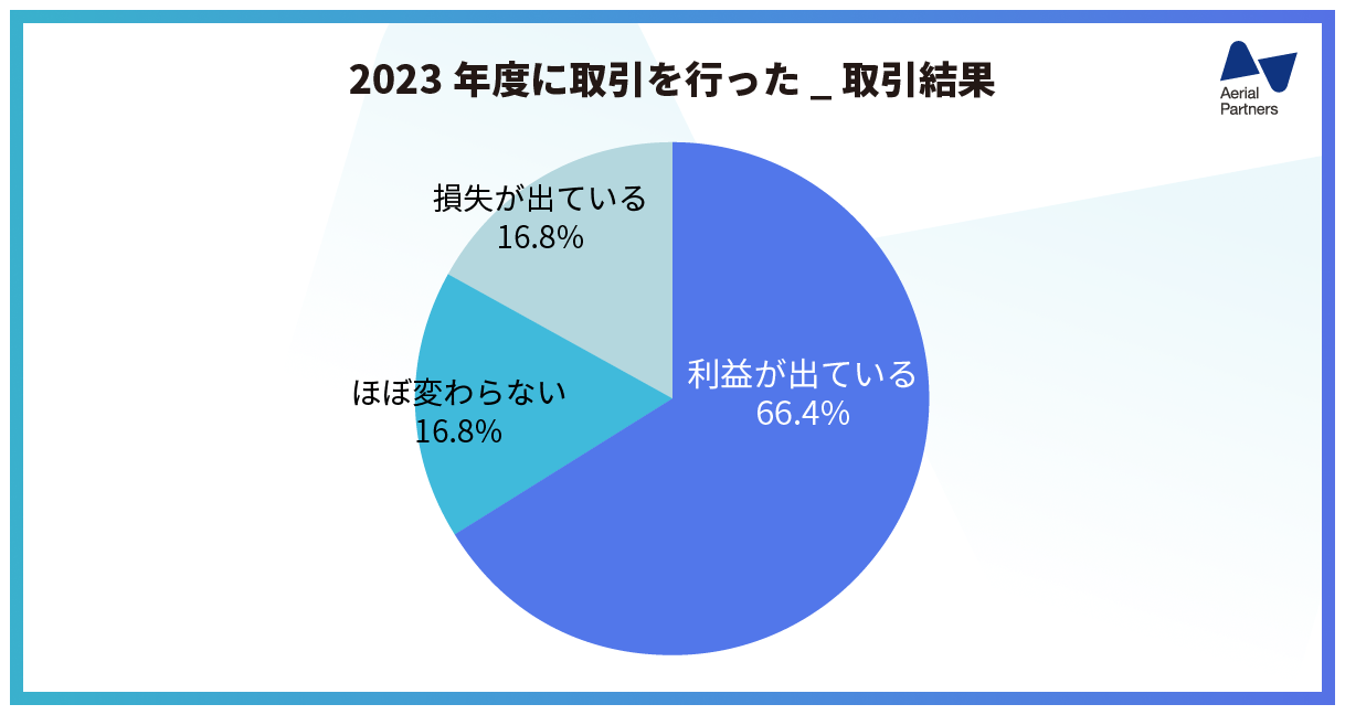 なお、同グループ全体では約7割が「利益が出ている」と回答しています。冒頭に記載した詳細記事では「投資額50万円以下」と「投資額501万円以上」のグループについてそれぞれ取引結果の傾向を掲載しておりますので、是非ご参照ください。