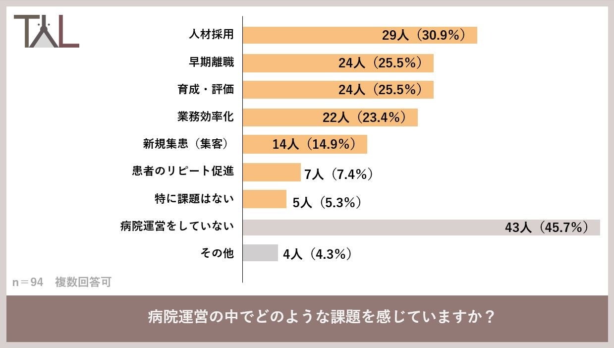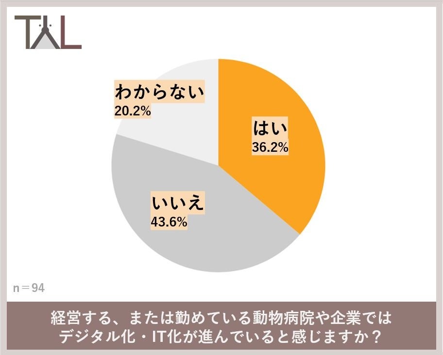 獣医師94名に対し、「経営する、または勤めている動物病院や企業ではデジタル化・IT化が進んでいると感じますか?」と質問したところ、「はい」と答えた人が34人(36.2%)、「いいえ」と答えた人が41人(43.6%)、「わからない」と答えた人が19人(20.2%)という結果になりました。獣医師94名に対し、「病院運営の中でどのような課題を感じていますか?(複数選択可)」と質問したところ、「病院運営をしていない」以外の回答では、1位人材採用、2位早期離職、育成・評価、3位業務効率化という結果になりました。