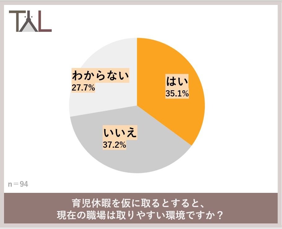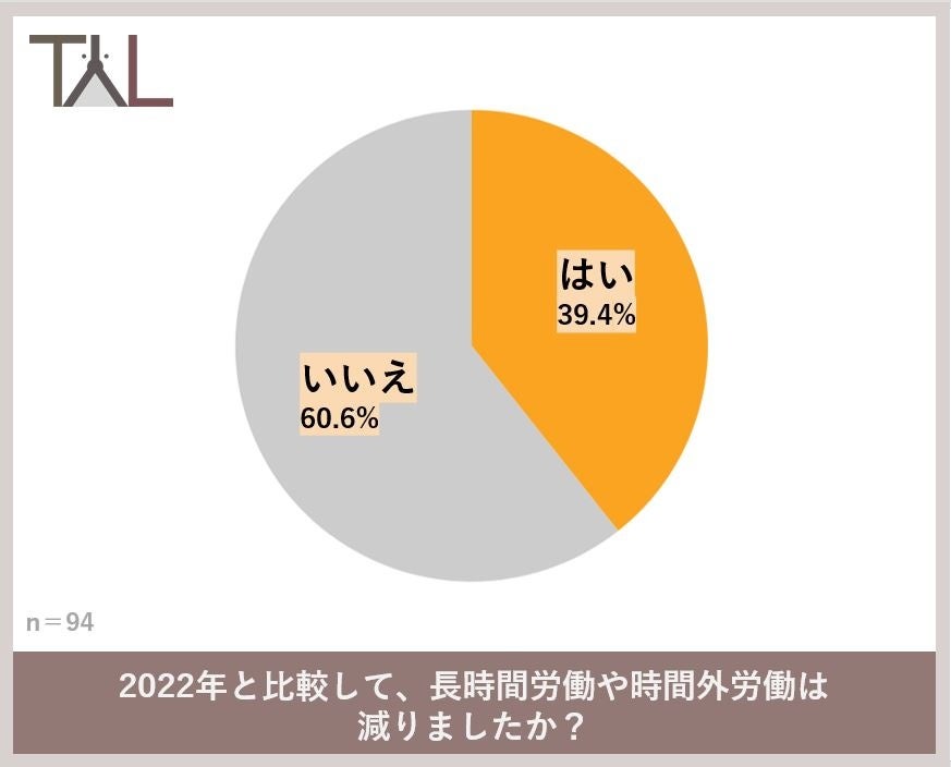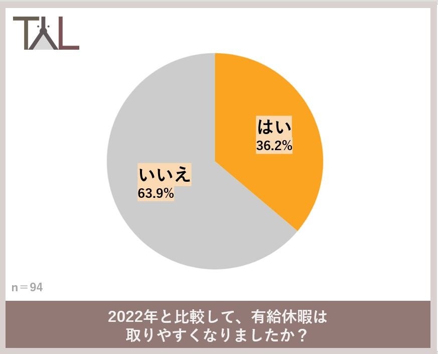 獣医師94名に対し、「2022年と比較して、長時間労働や時間外労働は減りましたか?」と質問したところ、「はい」と答えた人が37人(39.4%)、「いいえ」と答えた人が57人(60.6%)という結果になりました。獣医師94名に対し、「2022年と比較して、有給休暇は取りやすくなりましたか?」と質問したところ、「はい」と答えた人が34人(36.2%)、「いいえ」と回答した人が60人(63.9%)、という結果になりました。獣医師94名に対し、「育児休暇を仮に取るとすると、現在の職場は取りやすい環境ですか?」と質問したところ、「はい」と答えた人が33人(35.1%)、「いいえ」と答えた人が35人(37.2%)、「わからない」と答えた人が26人(27.7%)という結果になりました。