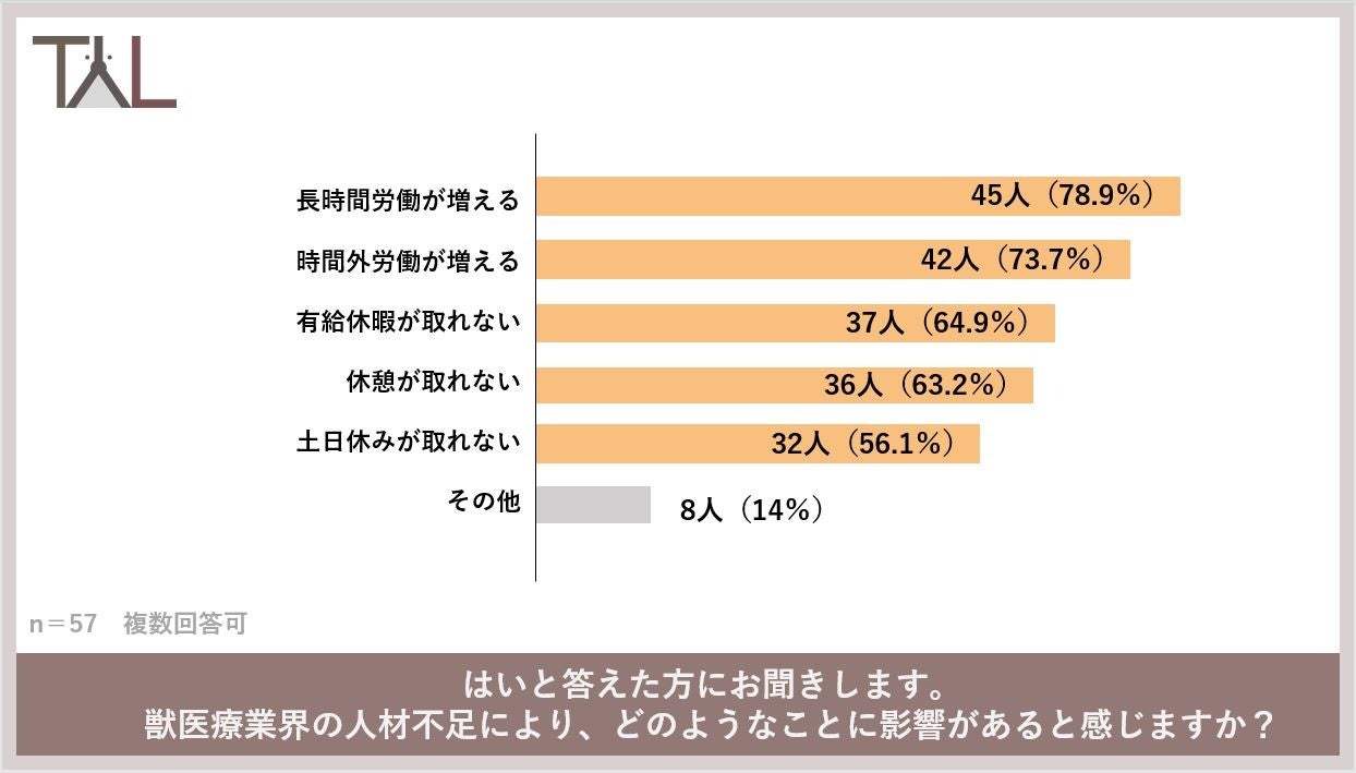 ◇獣医師の約6割が、獣医療業界は人材不足だと感じている。その影響1位は長時間労働が増えるという結果に。