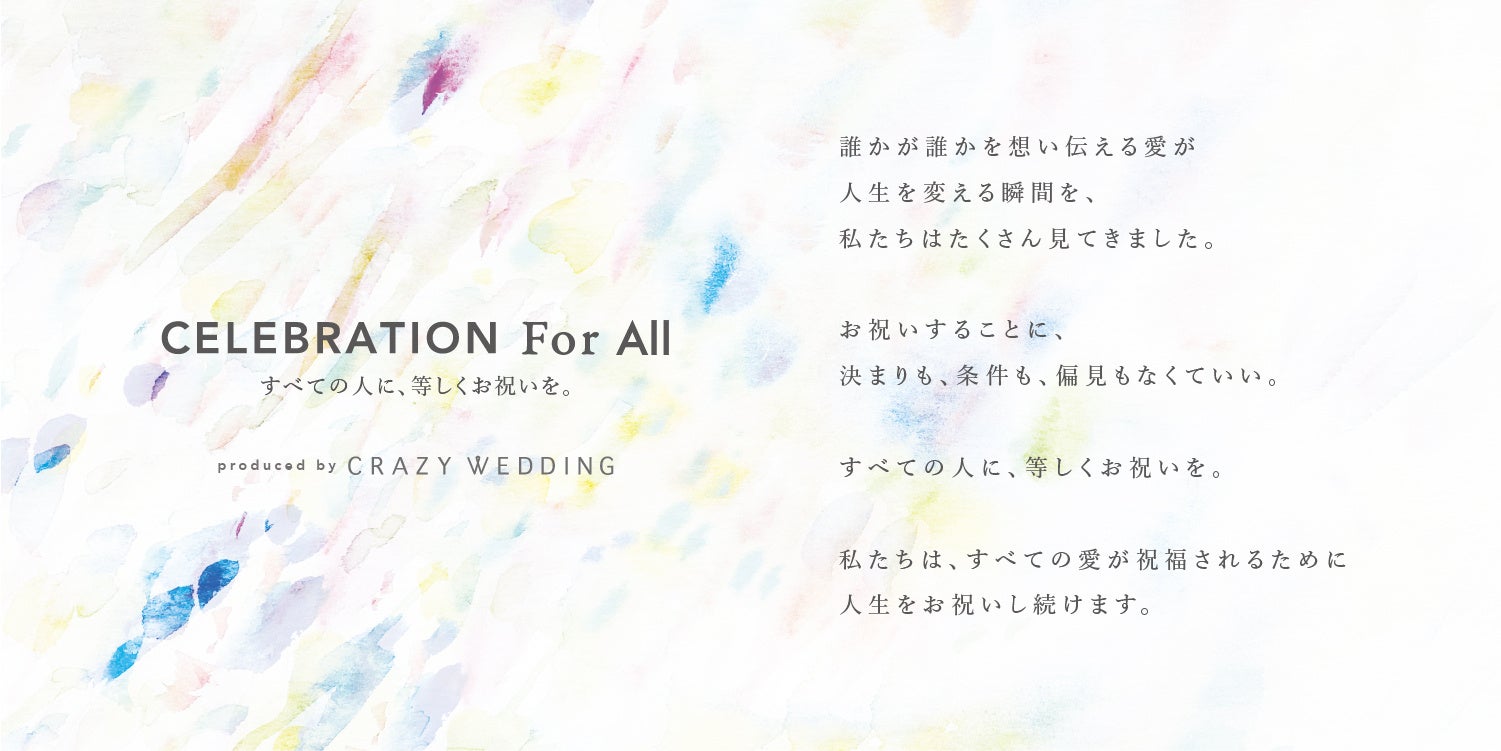 CRAZY WEDDINGは、2019年から「すべての人に等しくお祝いを」をコンセプトに掲げ、26組のLGBTQ+カップルをはじめ、さまざまなマイノリティを持った方々に人生を祝う機会を提供してきました。