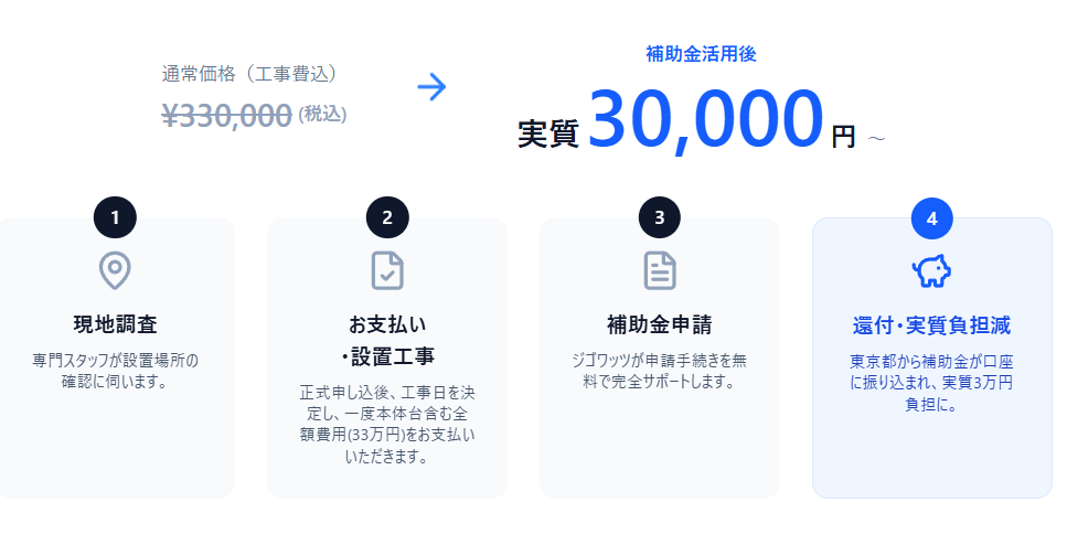 また、これまで設置者様ご自身にて行っていただいていた補助金申請ですが、ご希望の方はジゴワッツにて申請代行をさせていただきます。
