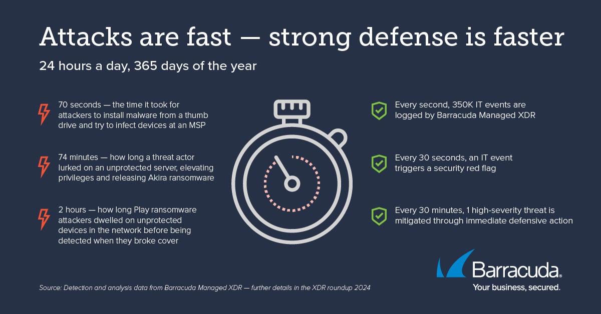 • Barracuda Managed XDRは2024年、11兆件のITイベントのログを記録しました。1秒あたりに35万件のイベントが発生していることになります。