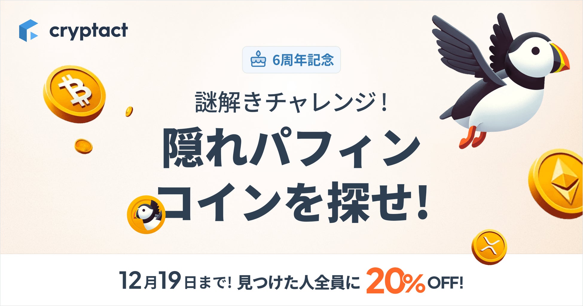 暗号資産の損益計算サービス「クリプタクト」、サービス開始6周年を記念してアニバーサリーキャンペーン「謎解きチャレンジ!隠れパフィンコインを探せ! 」を開催