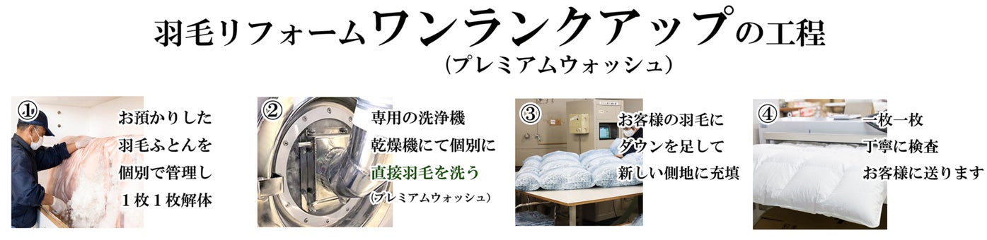 羽毛布団リフォームの工程は、①羽毛布団を解体 ②取り出した羽毛の洗浄・除塵・乾燥 ③足し羽毛 ④新しい側地へ充填、最後に異物の混入などがないか確認して出荷します。作業に際しては、ほかの顧客の布団と混在しないよう、徹底した個別管理の下でお客様の羽毛布団を1枚1枚加工いたします。