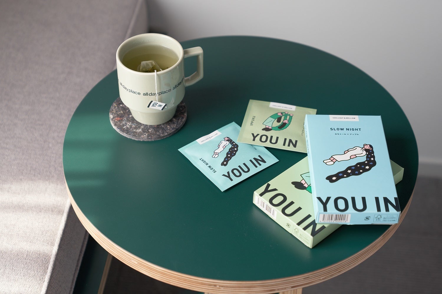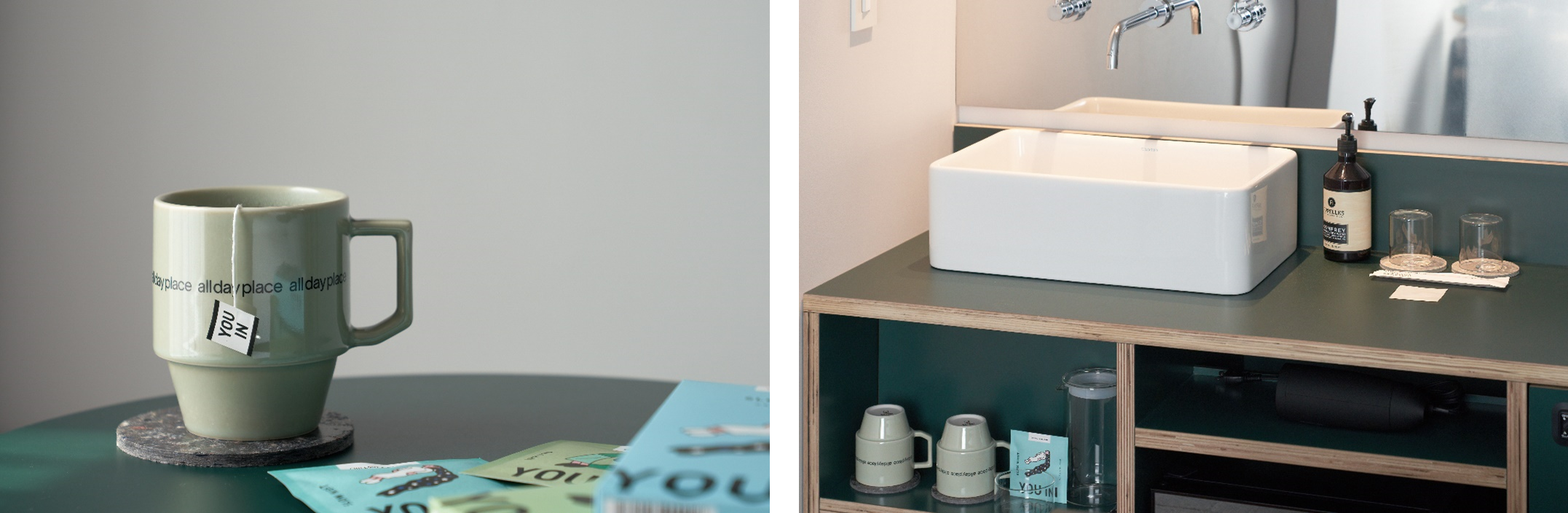 アートや音楽、ファッションなど魅力あるコンテンツにあふれる渋谷。そんな渋谷のパブリックハウスを目指す「all day place shibuya」には、きらびやかな装飾や演出ではなく、ほっと安心してちょうどいい、日常の延長のような場所であってほしい、という想いが込められています。今回のコラボレーションは、このようなホテルの想いに対し、気分やシーンなど“ムード(今その瞬間の気分や状態)” に “ペアリング(向き合い、寄り添い、そして肯定する)”というウェルネス*に基づく新しいお茶のD2Cブランドである「YOU IN」の考え方が一致し、実現しました。「YOU IN」がホテルに常設されるのは初めての試みになります。