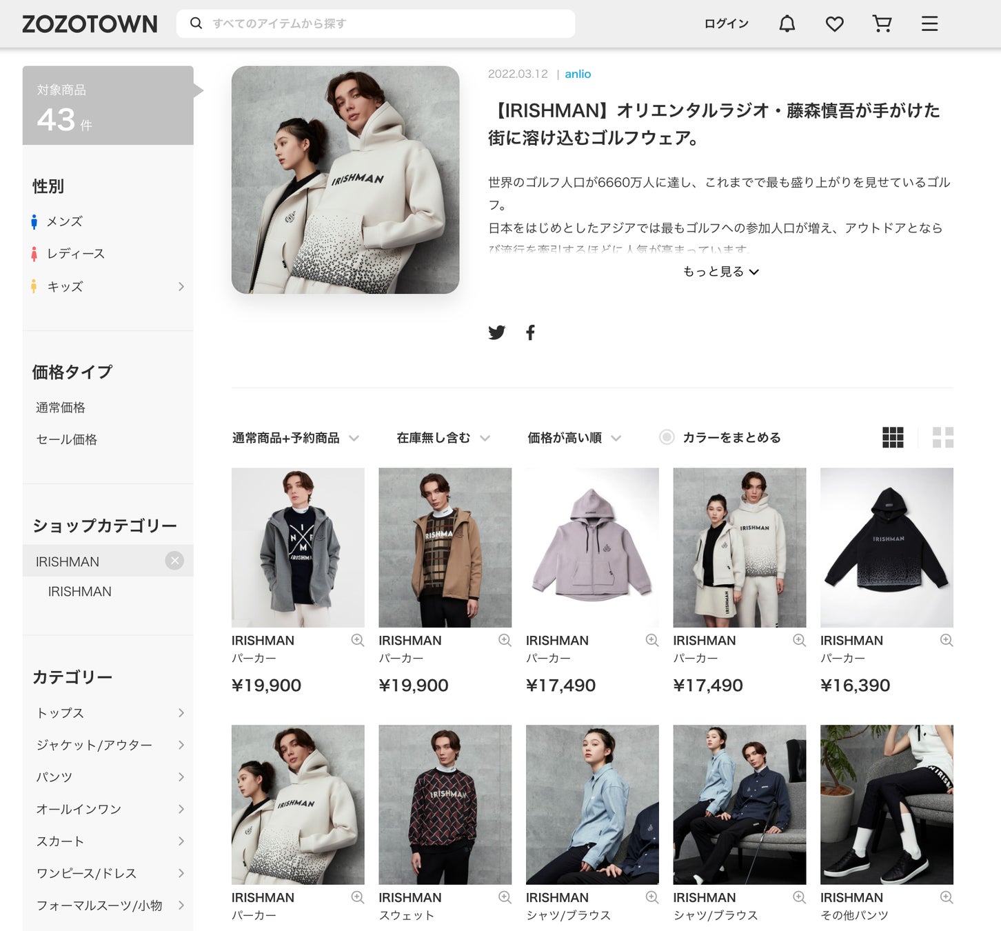 これまでの『IRISHMAN』のアイテムは全て公式オンラインサイトのみの販売でしたが、2022年3月12日(土)よりZOZOTOWN anlio(https://zozo.jp/shop/anlio/detail/)にて一部アイテムを発売中です。また、今後リリース予定の春の新作アイテムの先行発売も実施中です。是非ご覧下さい。