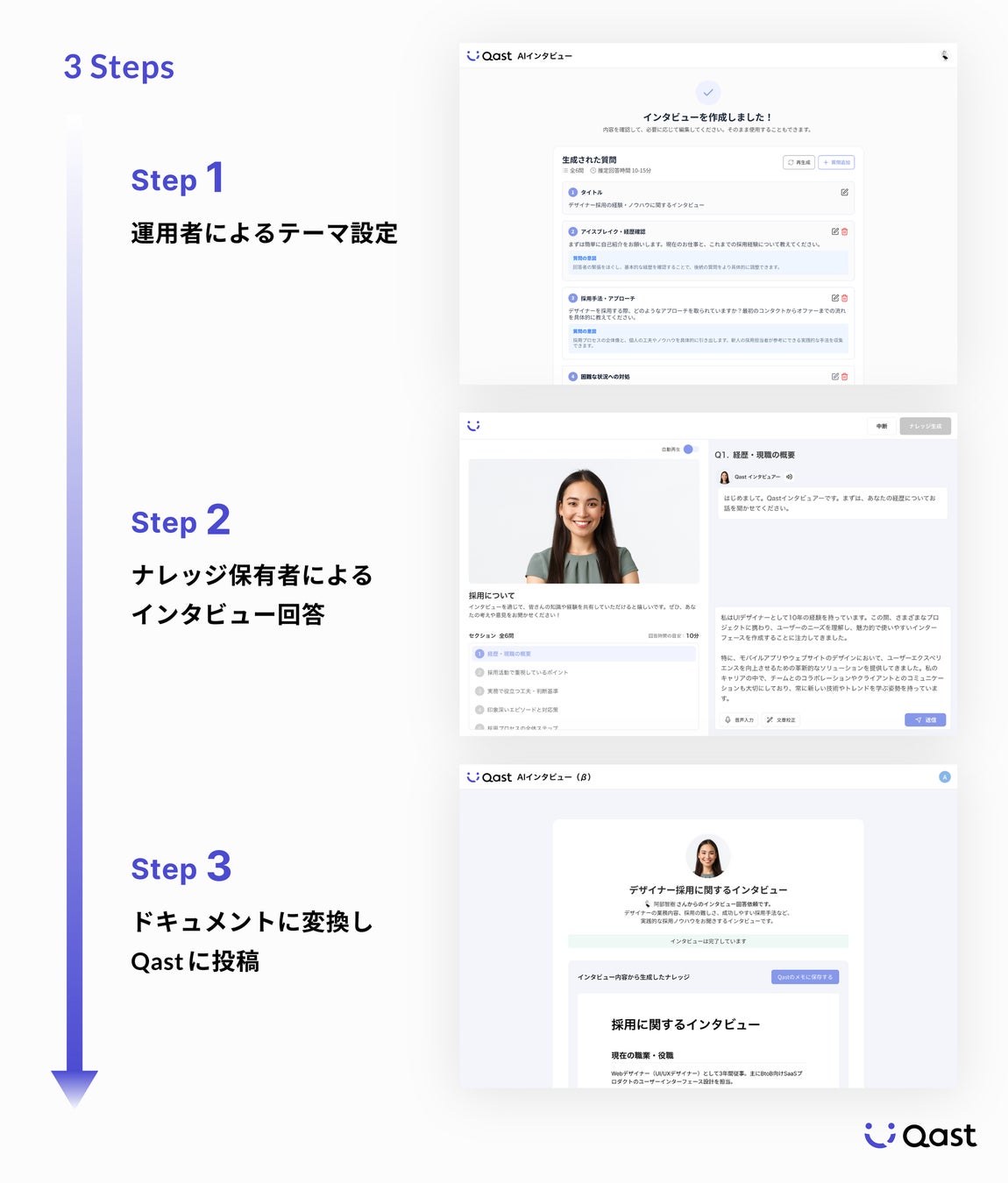 「AIナレッジインタビュー」は、基本的に3つのステップで構成されています。