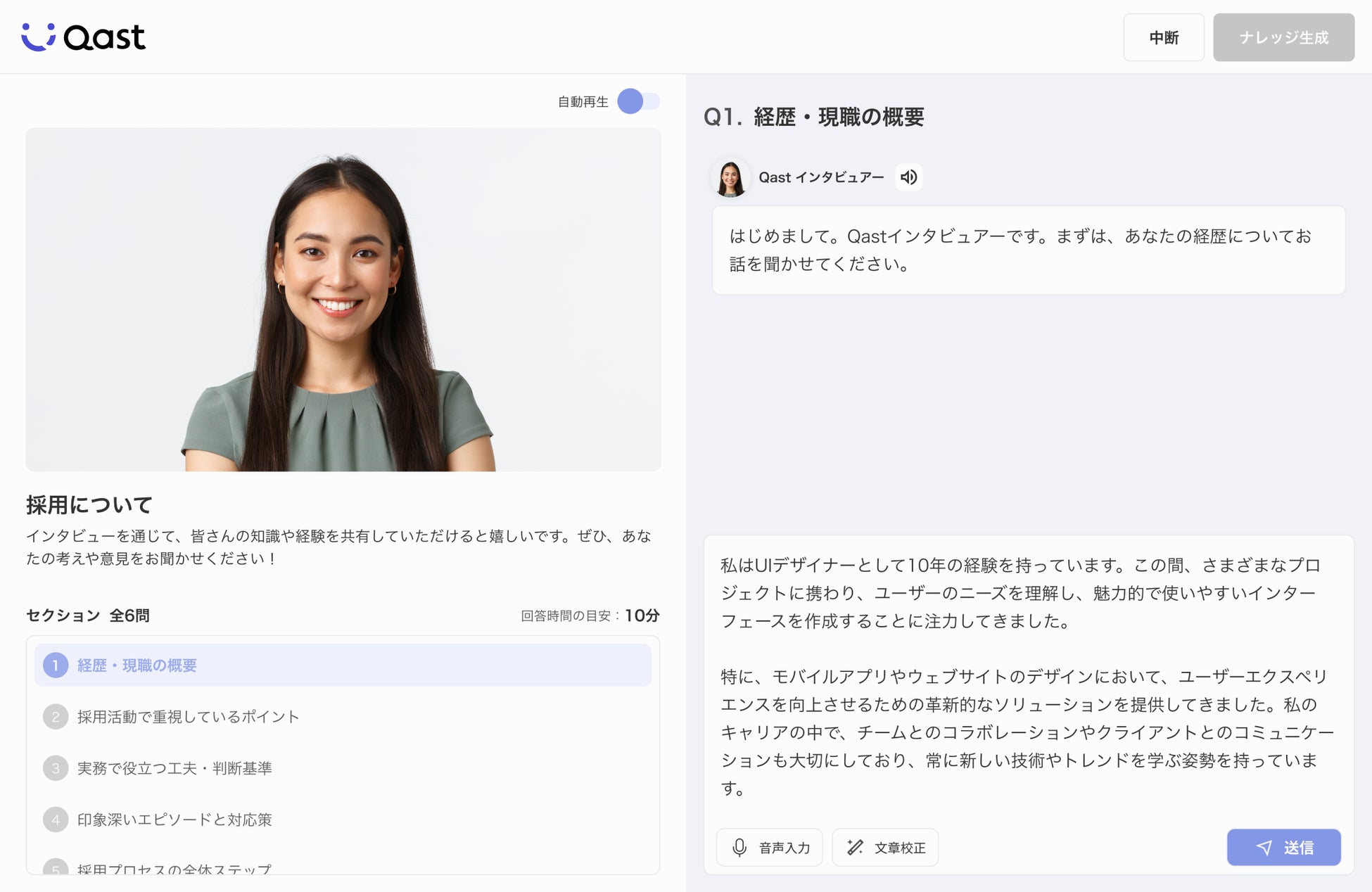 この度「Qast」に追加される「AIナレッジインタビュー」は、画面上に表示されるAIのインタビュアーと会話をすることで会話が自動的に文字化され、自然とナレッジが引き出される機能です。