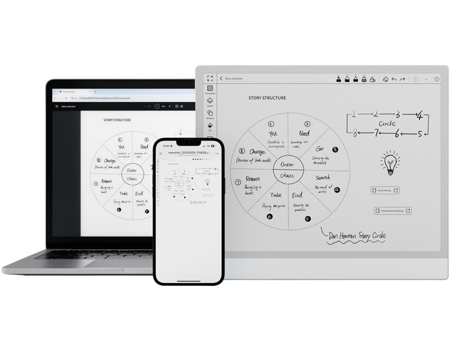 13.3インチのCarta 1300モノクロE-inkスクリーンを採用し、3200 x 2400(300 ppi)の高解像度で鮮明な文字表示を実現。職場や自宅など明るい環境での使用を想定し、フロントライトを省略した設計により、明るい背景と読みやすい文字表示を可能にしています。また、電子ペーパーの特性により、長時間使用しても目に優しい視認性が備わっています。