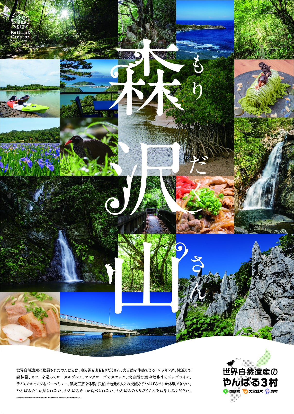 プロフェッショナル人財の育成を通じて、クリエイターに新たな働き方を提案する株式会社クリエイターズマッチ(本社:東京都渋谷区、代表取締役:呉京樹、以下「クリエイターズマッチ」)が主催する『Rethink Creator PROJECT』は、同プロジェクト内の「地域デザインファクトリー沖縄」において、沖縄北部3村(国頭村、大宜味村、東村)が抱える地域課題の解決に向けて、地元クリエイターが協働でクリエイティブ作品を制作しました。