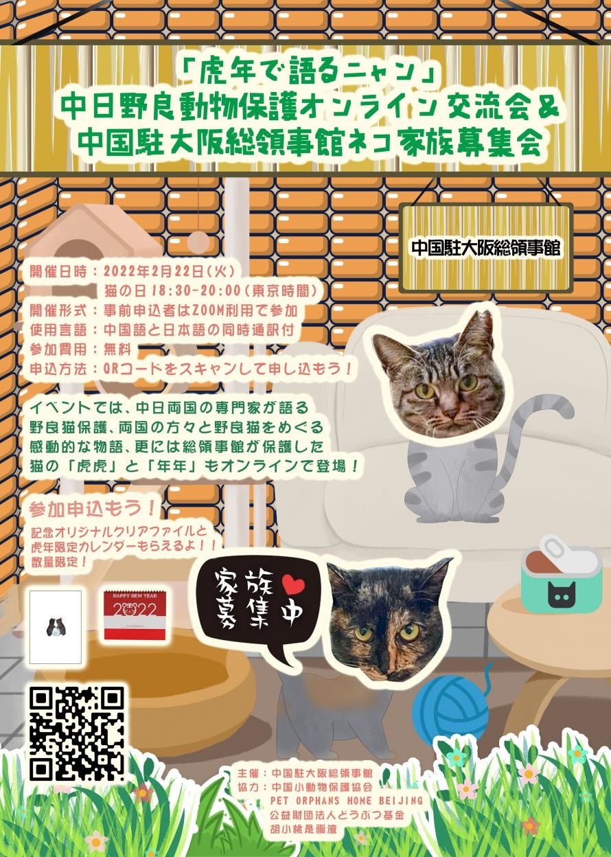中国駐大阪総領事館は2月22日猫の日「虎年で語るニャン」 中日野良動物保護オンライン交流会&中国駐大阪総領事館ネコ家族募集会を開催、参加者を募集します。公益財団法人どうぶつ基金では理事長が「さくらねこTNR」について講演します。