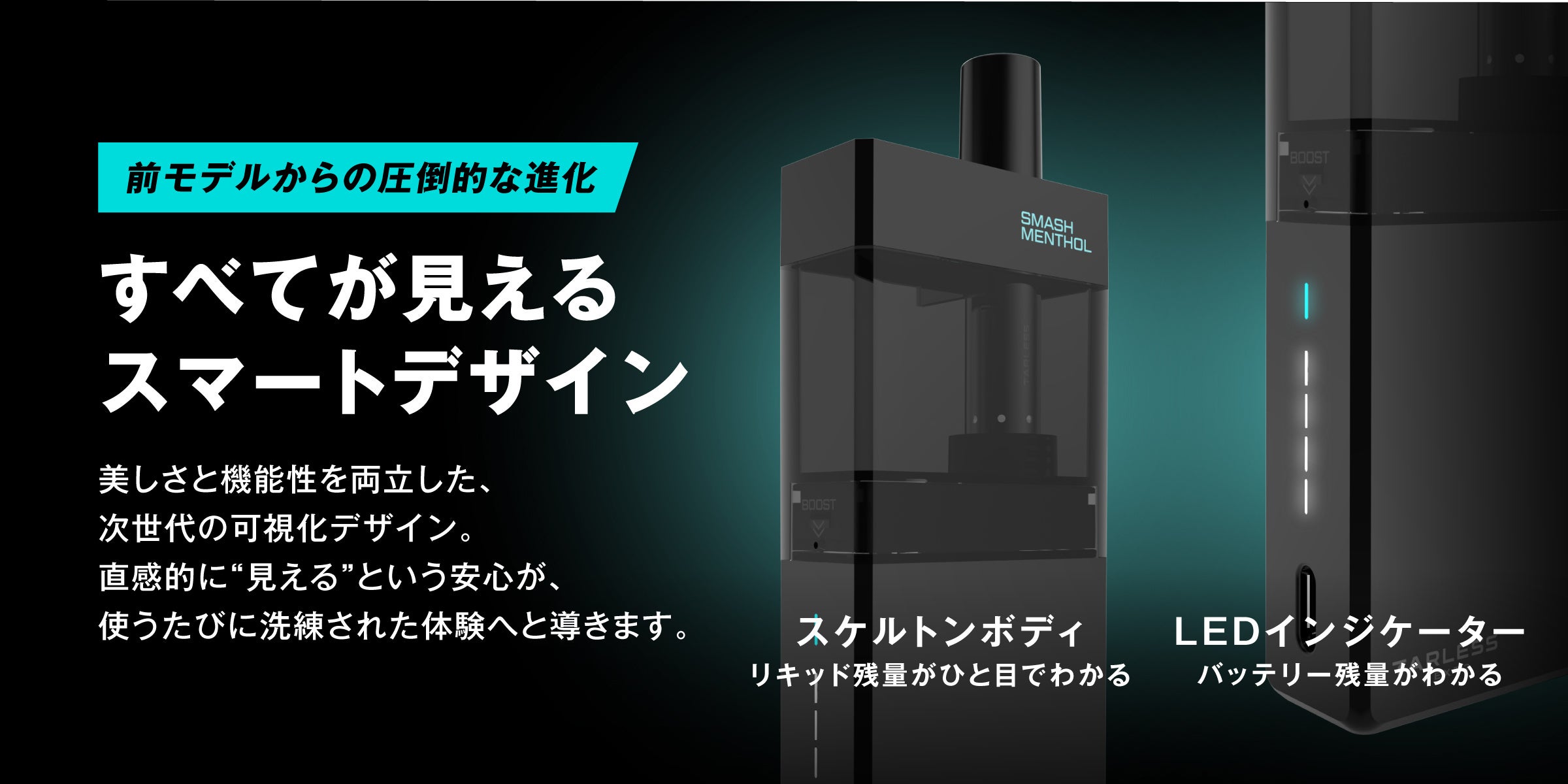 また、カートリッジの装着方向によって、切り替えられる「BOOSTモード」を搭載。通常の吸引(ノーマルモード)でも、旧モデルを上回る濃厚さですが、BOOSTモードでは一気に出力を高め、“重厚な煙の質感”と“深いコク”を演出します。まるで一口ごとにリキッドが新鮮に生まれ変わるような感覚を目指し、味・香り・煙量のすべてを再設計しました。
