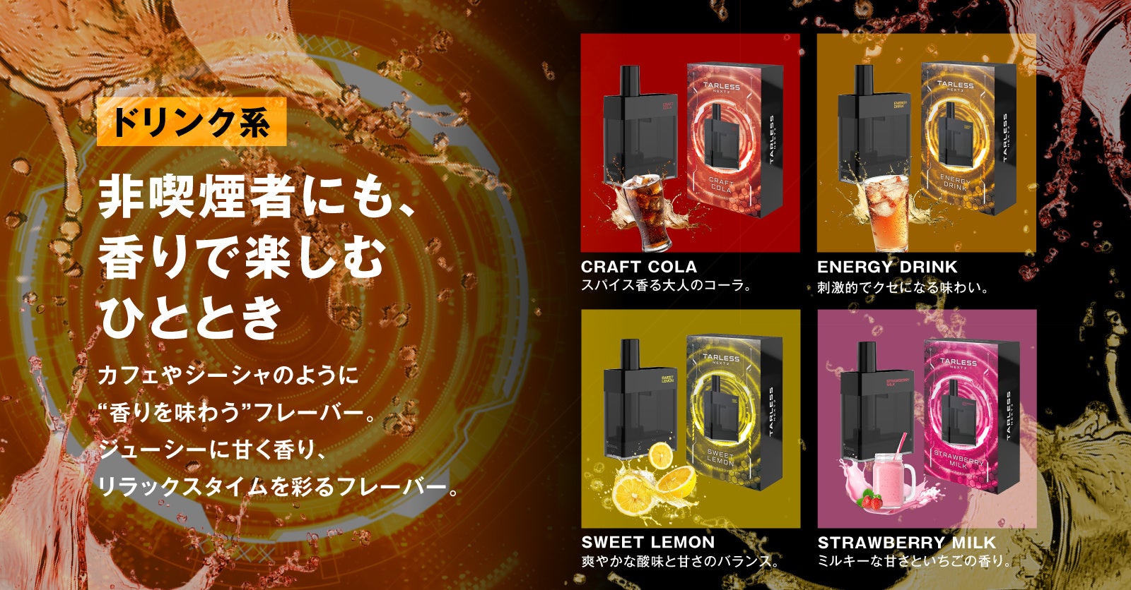 喫煙者の方に人気の(1) メンソール系・(2) タバコ系フレーバー、喫煙者の方にも非喫煙者の方にもお楽しみいただける(3) フルーツメンソール系・(4) ドリンク系フレーバーの幅広い4つの世界観を1つのデバイスでお楽しみ頂けます。