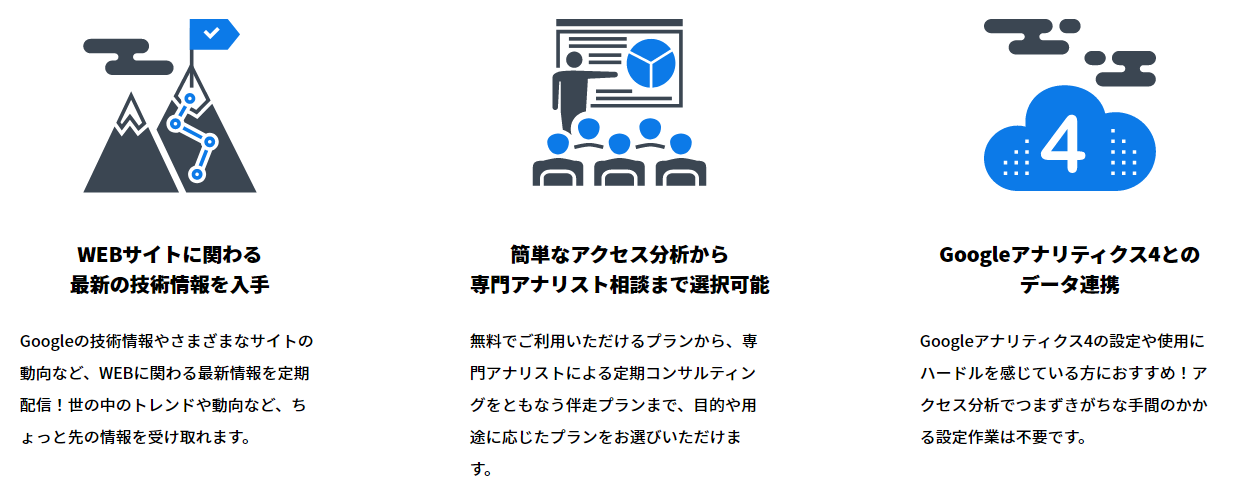 また、Googleが提供するユニバーサルアナリティクスの処理が2023年7月1日をもって停止され、Google Analytics(以下、GA4)への移行が必要となることが発表されました。Webサイトを効果的に運用しマーケティング効果を高めるためには、アクセス数やユーザーの行動等を把握し、対策や打ち手を検討することが重要ですが、GA4でのアクセス分析を行うためにはツールへの理解と詳細な設計が必要となり、多くの時間や専門知識が必要な状況があります。