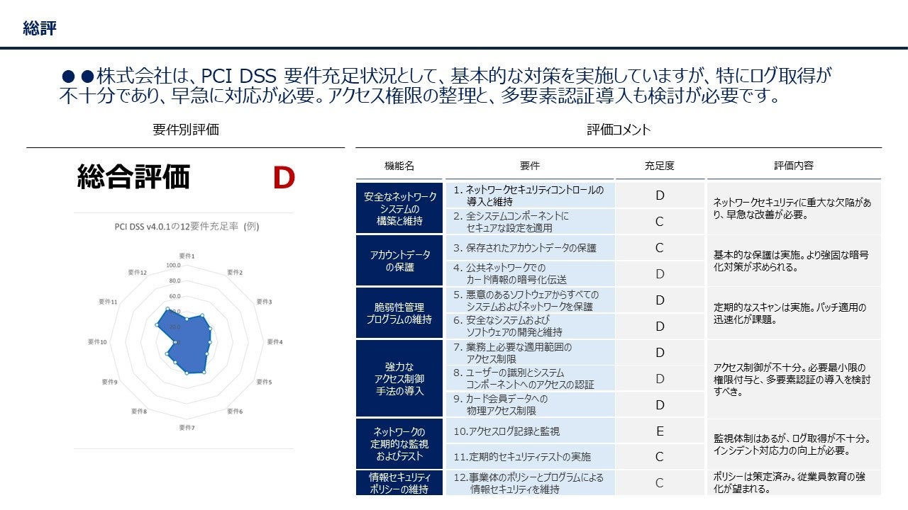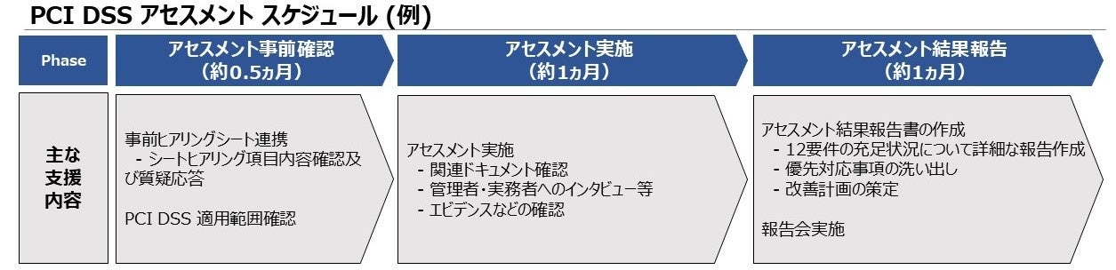 新しくリリースされた「PCI DSS v4.0.1」の要件を網羅したアセスメントシートを活用し、PCI DSS 準拠状況を評価することが可能です。当社の経験豊富なエキスパートが必要な対策の提示やロードマップの策定・実行を伴走型でご支援いたします。