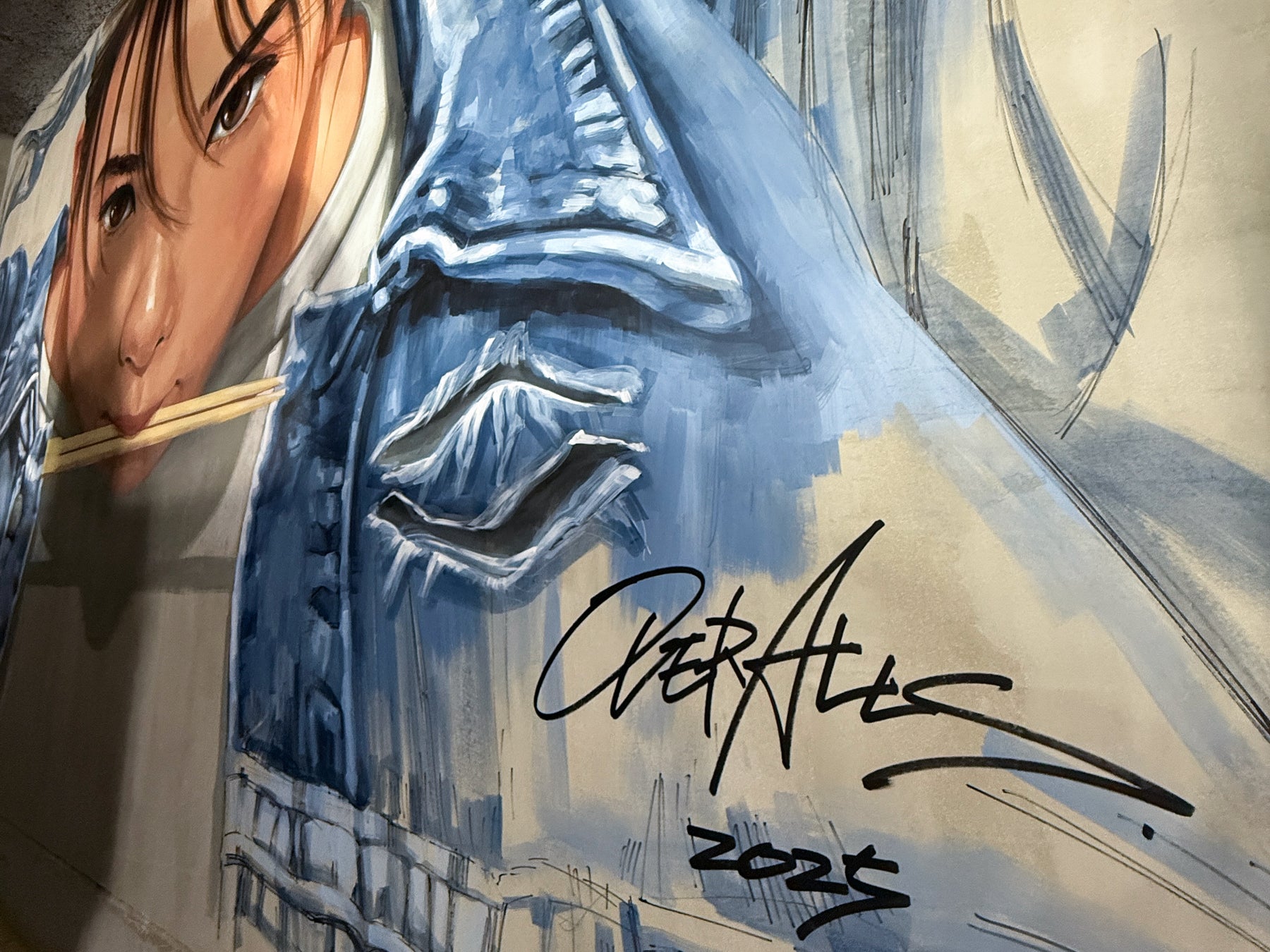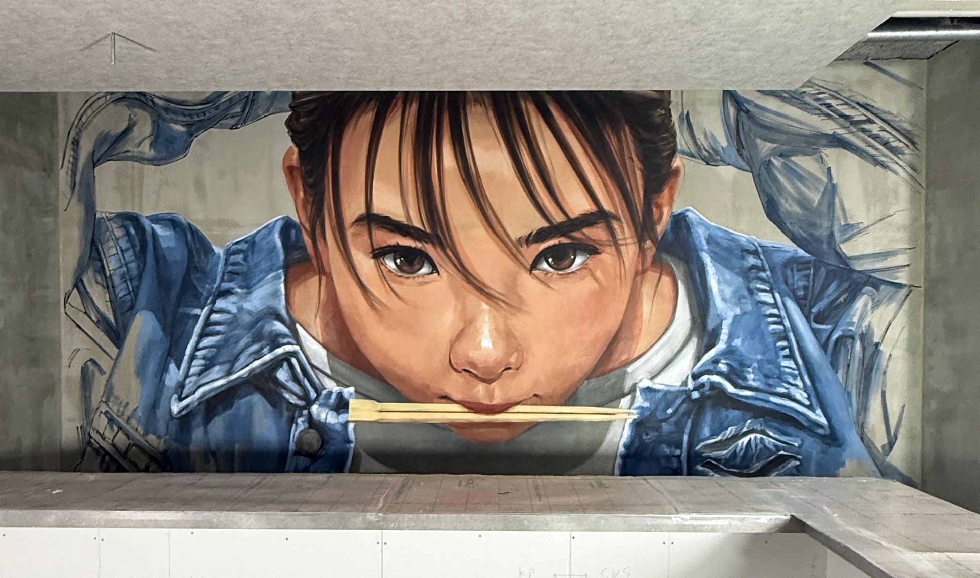 そんな「挑戦」と「情熱」を象徴する少女を描き、この東京の中心で博多うどんの“のろし”を上げる中村氏の想いを壁画に込めました。