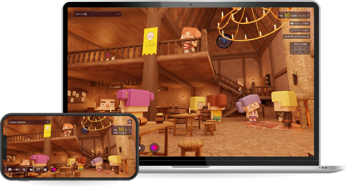 「V-expo」は、ブラウザで利用できるメタバースイベントスペースです。パソコン、スマートフォン、タブレットのWEBブラウザからアクセスできるため、VRデバイスや専用アプリは不要です。