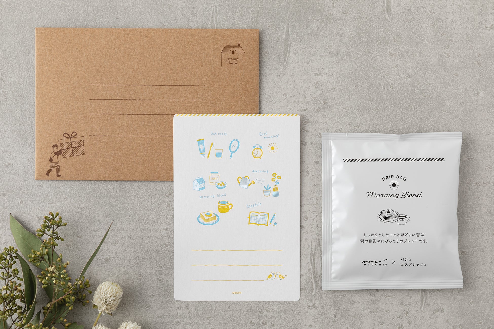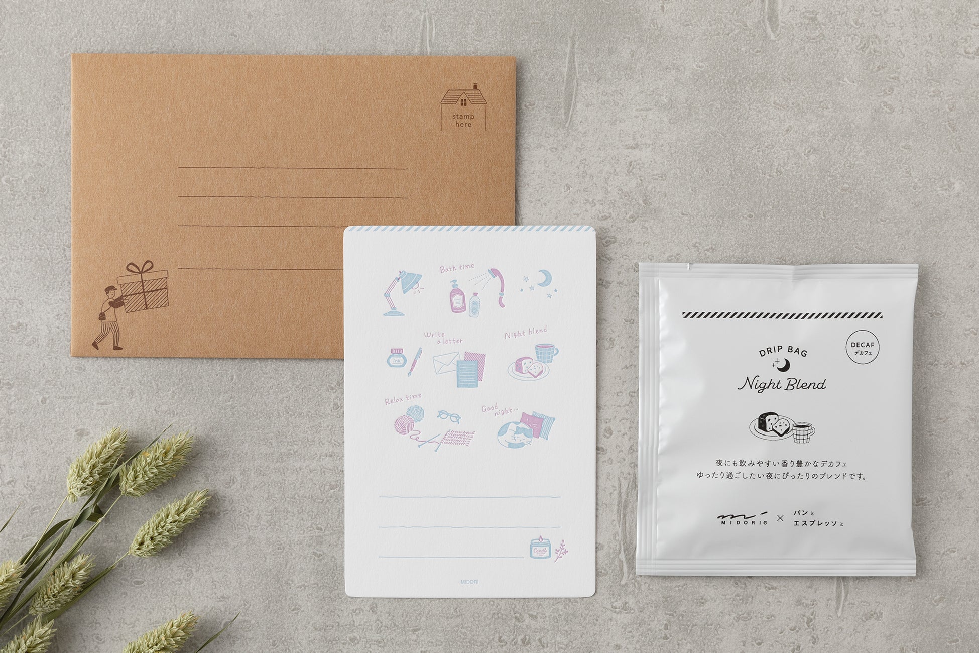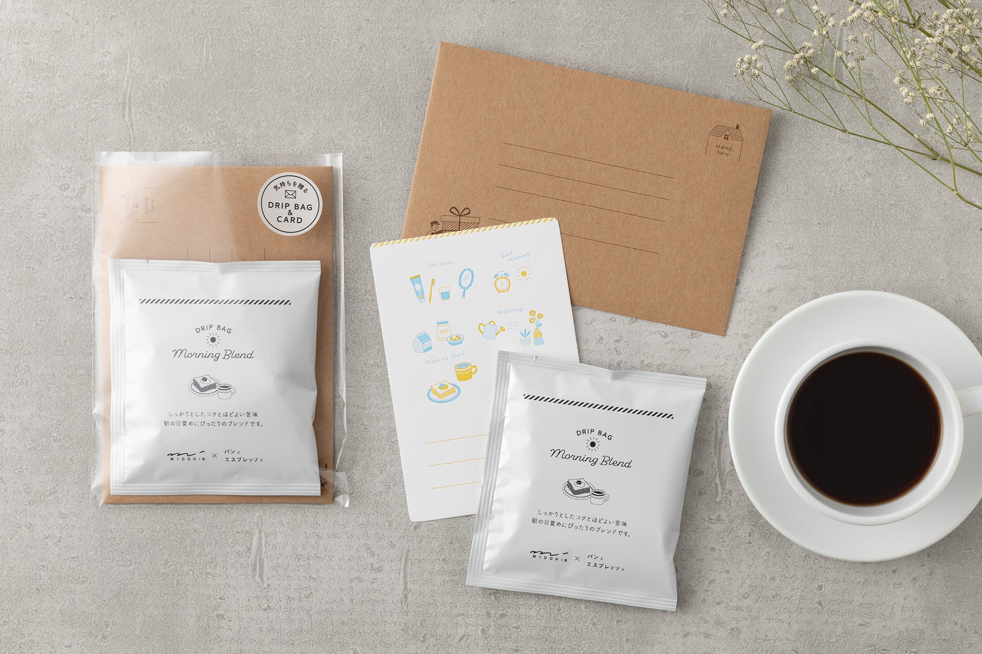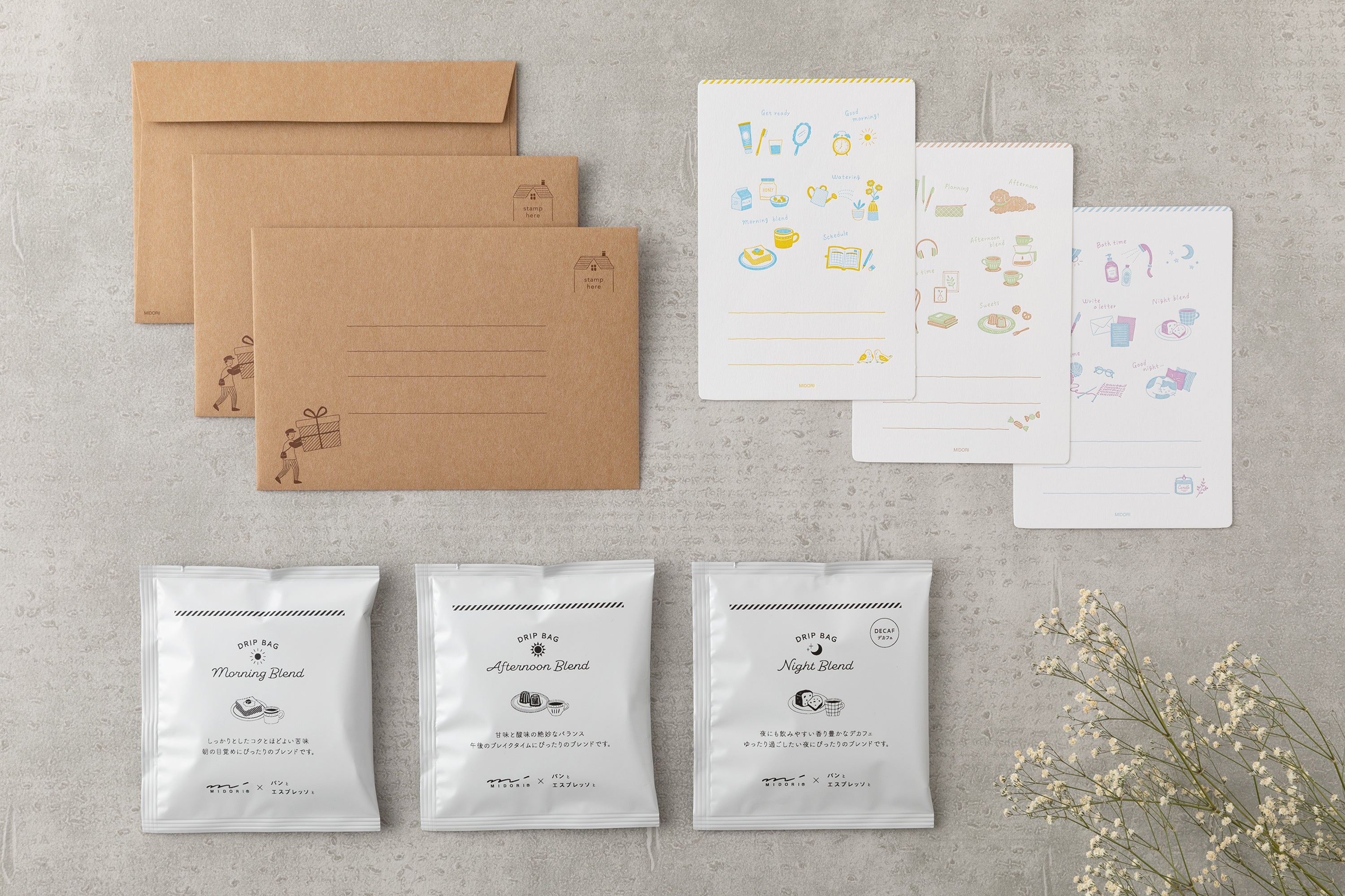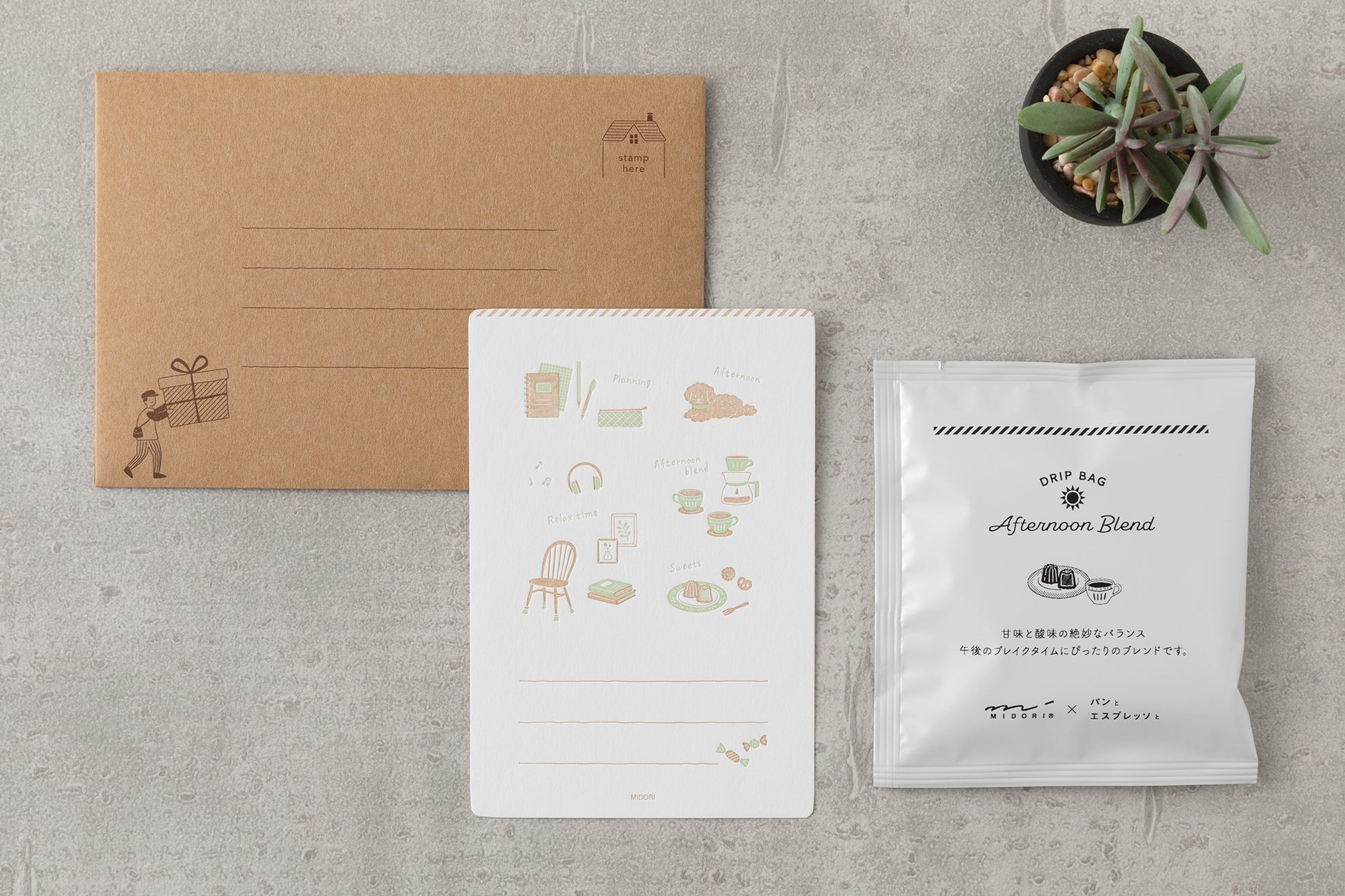 「パンとエスプレッソと」が焙煎した 3 種類の味のドリップバッグコーヒーと、「ミドリ」の活版印刷のメッセージカードと封筒がセットになった『ドリップバッグ・封筒付カード』。忙しそうな会社の同僚への差し入れ、クリスマスやバレンタインのちょっとしたプチギフトなど、身近な人とのコミュニケーションにぴったりです。手渡しはもちろん、切手を貼って郵送することもできます。(※定形外です)