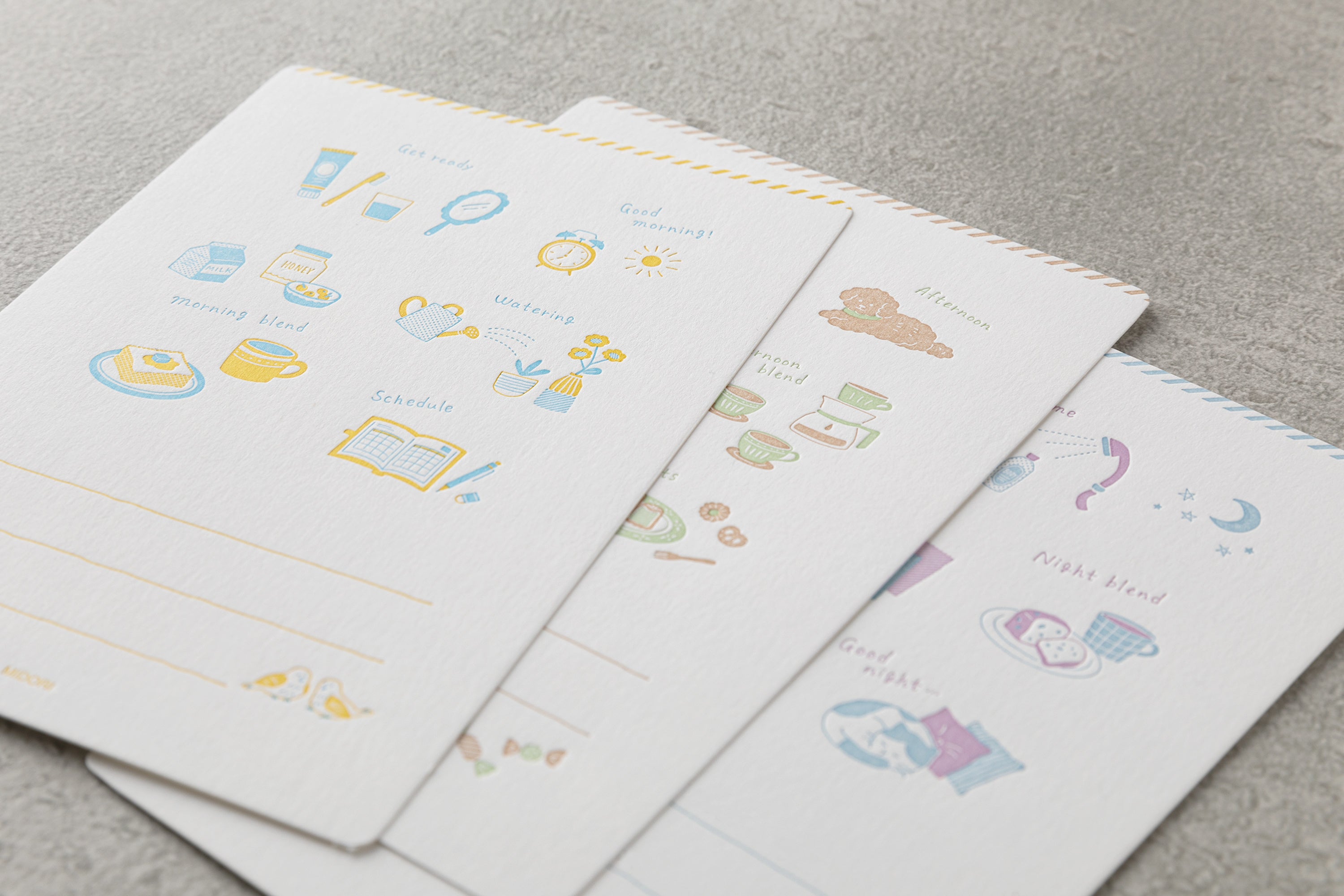 贈る相手やシーンに合わせて「モーニングブレンド」、「アフタヌーンブレンド」、「ナイトブレンド」の3種類のテイストからお選びいただけます。「パンとエスプレッソと」で人気のブレンドのほか、今回だけのオリジナルブレンドも特別にご用意しました。メッセージカードは、それぞれのシーンをイメージしたモチーフを優しい風合いでデザインし活版印刷で 1 枚ずつ丁寧に仕上げています。