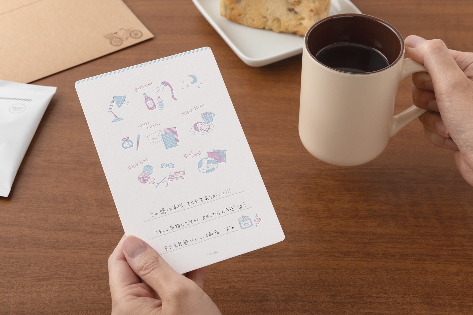 カードは、眠りにつく前に過ごす静かな夜の時間を、優しい色味で表現しました。