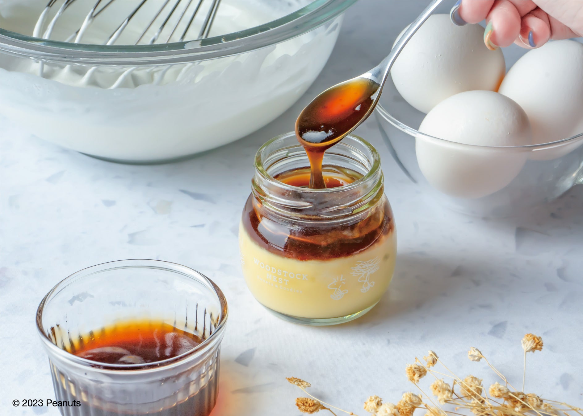 なめらかカスタードプリンに、とろーりみたらしソースをたっぷり。