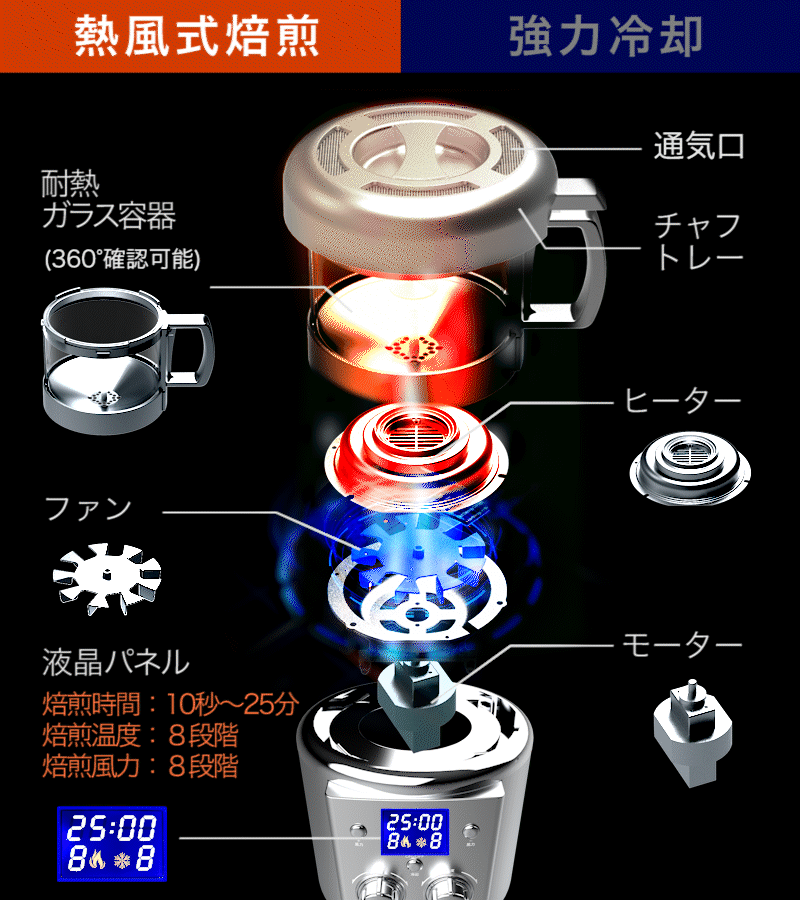 焙煎できる焙煎度の幅が広がり、ガラス製の容器でコーヒー豆の焙煎経過を確認しながら、自分好みの焙煎度に自由に調節することができます!