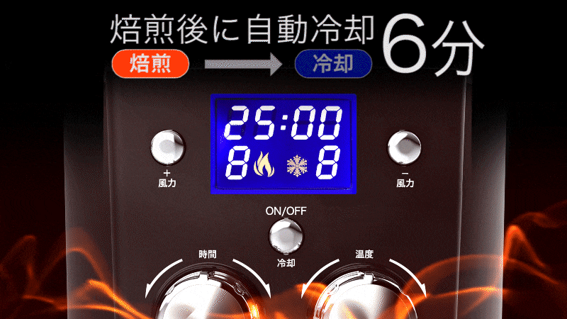 冷却設定:焙煎中に冷却ボタンの押すと冷却に切り替わり、3秒以上長押しすると停止します。