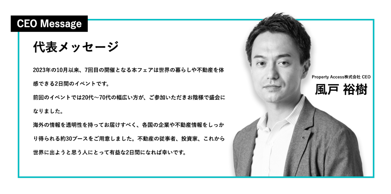 2017年に第1回目の開催が行われた本イベントは、不動産を主軸に、海外での暮らしや、投資機会を学ぶため展示会で、海外不動産をテーマにしたイベントとしては国内最大規模を誇ります。国外への移住や投資ニーズが高まる中、第7回目である今回もおよそ7カ国、30以上の企業ブースが設けられ、様々な国の現地での暮らしや投資環境についての理解が深まる二日間となります。