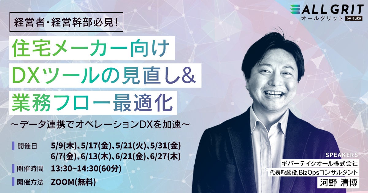 住宅・不動産業界向けLINE運用ツール《ALL GRIT(オールグリット)》を提供するギバーテイクオール株式会社(本社:東京都港区、代表取締役CEO 河野清博、以下当社)は、この度『住宅メーカー向け DXツールの見直し&業務フロー最適化セミナー』を開催いたします。