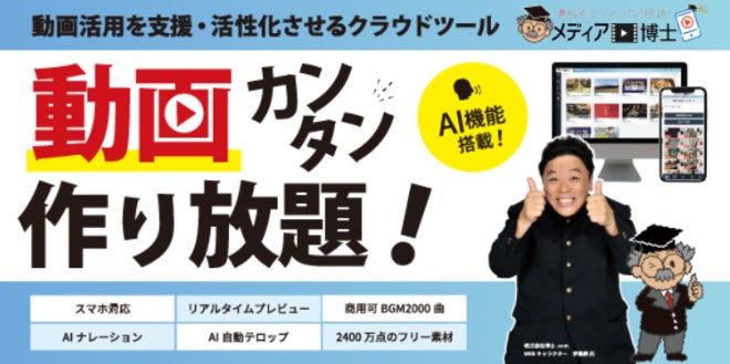 クラウド動画作成ツール【メディア博士】は、AI機能を搭載し、初心者でも直観的に操作しやすく、ビジネスシーンでの利用に最適な機能を備えた動画作成ツールです。