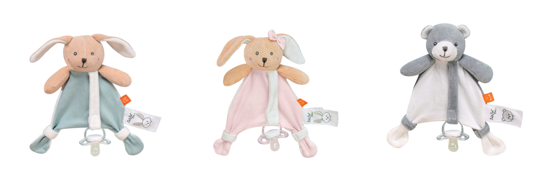 おしゃぶりホルダーと赤ちゃんが肌身離さず持つ"ドゥードゥー"が一緒になりました。ぬいぐるみとしても使えます。GOTS認証取得のオーガニック繊維使用。