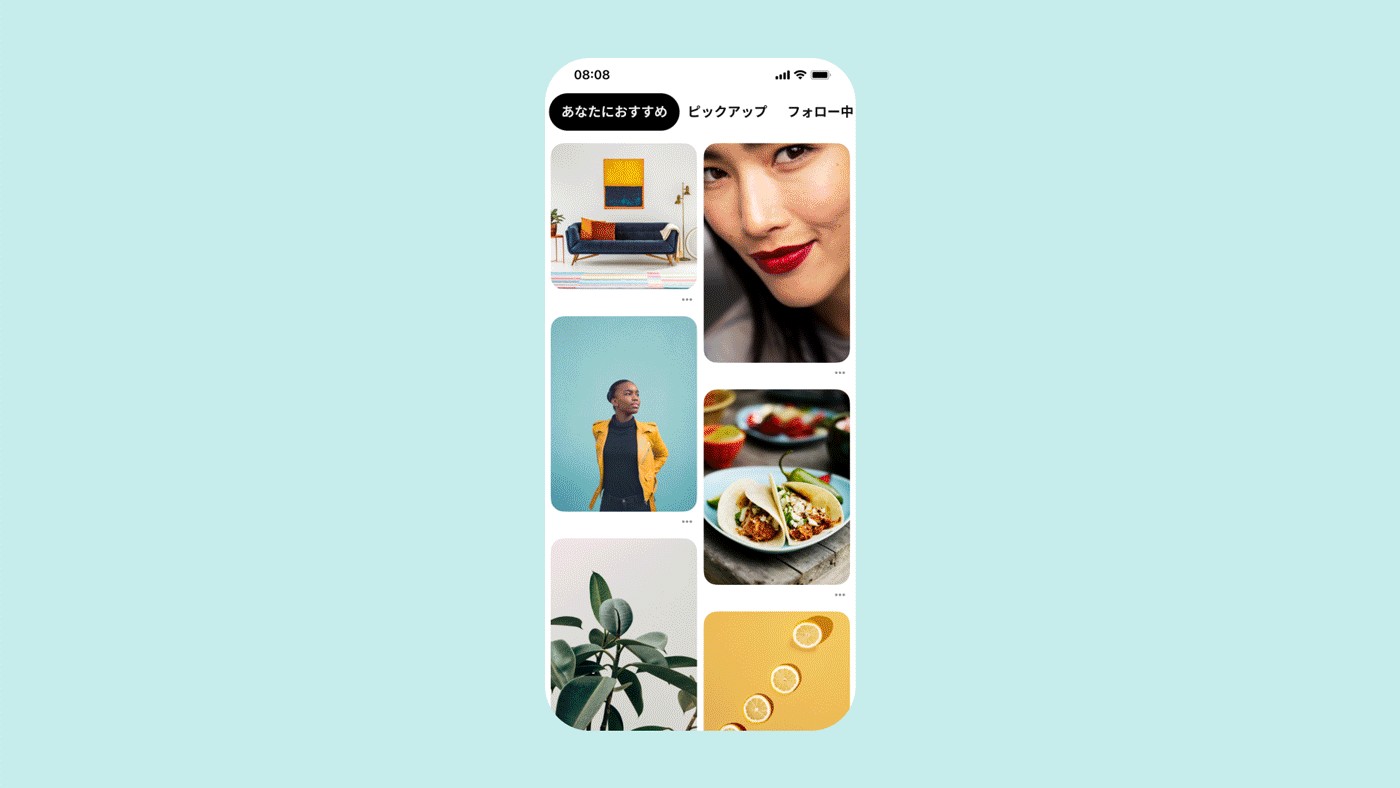 ユーザーは、iOS または Android の Pinterest アプリのホームフィード上部にある「ピックアップ 」をクリックするだけで毎日更新される様々なトピックの新しいアイデアにアクセスすることが可能です。現在アイデアは Pinterest がキュレーションしていますが、今後はゲストエディターも参加予定です。ホームフィードは、引き続きユーザーのアクティビティに基づくおすすめが表示されるパーソナライズされたスペースとなりますが、「ピックアップ」には世の中の出来事やユーザーの検索内容に基づいた注目のアイデアが表示されます。