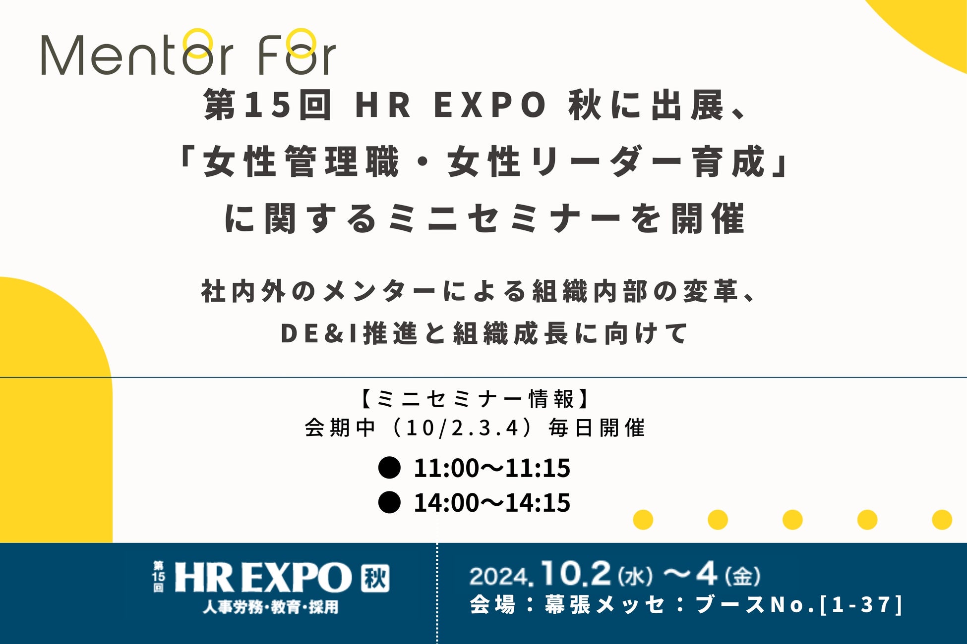企業のDE&I(Diversity, Equity & Inclusion)・女性活躍推進を目的とした、社外メンターの育成・マッチング・社内メンター制度支援を提供する株式会社Mentor For(東京都渋谷区、代表取締役・池原真佐子、以下Mentor For)は、2024年10月2日(水)~4日(金)の3日間、幕張メッセで開催する「第15回 HR EXPO (人事労務・教育・採用)秋」にブース出展いたします。あわせて出展ブース内にて「女性管理職・女性リーダー育成」に関するミニセミナーを開催します。