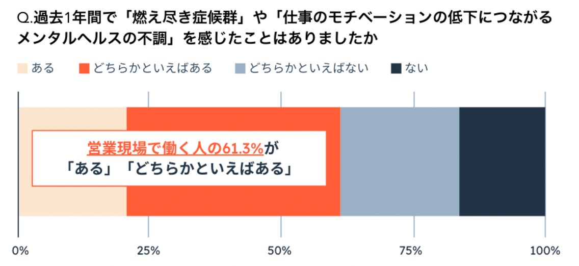 売り手に、営業組織における社員教育やマネジメント面の課題を複数回答で尋ねたところ、前回調査と同様1位は「従業員のモチベーション維持(45%)」となりました。従業員の「メンタルヘルス」の実態を見てみると、営業現場で働く人の61.3%が「直近1年間で燃え尽き症候群やメンタルヘルス不調を感じたことがある」と回答しており、営業組織のメンタルヘルス向上は深刻な課題の1つであることがわかります。