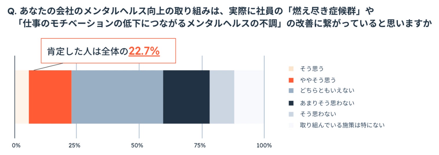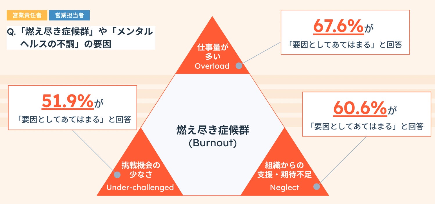 営業責任者と営業担当者に、「燃え尽き症候群」や「仕事のモチベーションの低下につながるメンタルヘルスの不調」の要因*として、「仕事量の多さ(overload)」「挑戦機会の少なさ(under-challenged)」「組織からの期待・支援不足(neglect)」がどの程度あてはまるか尋ねたところ、職場でのメンタルヘルス疲弊の要因として想像しやすい「仕事量の多さ(67.6%が「あてはまる」と回答)」と同等に、「上司や組織からの支援や期待の不足(60.6%)」や「仕事における挑戦機会の少なさ(51.9%)」も「燃え尽き症候群」を引き起こしていることが明らかになりました。