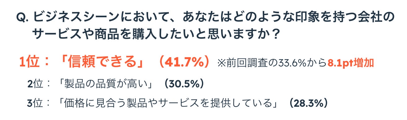 買い手に対して「ビジネスシーンにおいて、あなたはどのような印象を持つ会社のサービスや商品を購入したいと思いますか?」を尋ねたところ、前回調査同様、1位が「信頼できる(41.7%)」となり、2位の「製品の品質が高い(30.5%)」や3位の「価格に見合う製品やサービスを提供している(28.3%)を上回る結果となりました。また、「信頼」を選択した買い手は昨年より8.1pt増加しており、マクロ経済状況が厳しく変動している中でも、「価格」や「品質」を超えて「信頼」の重要度が増していることがわかりました。