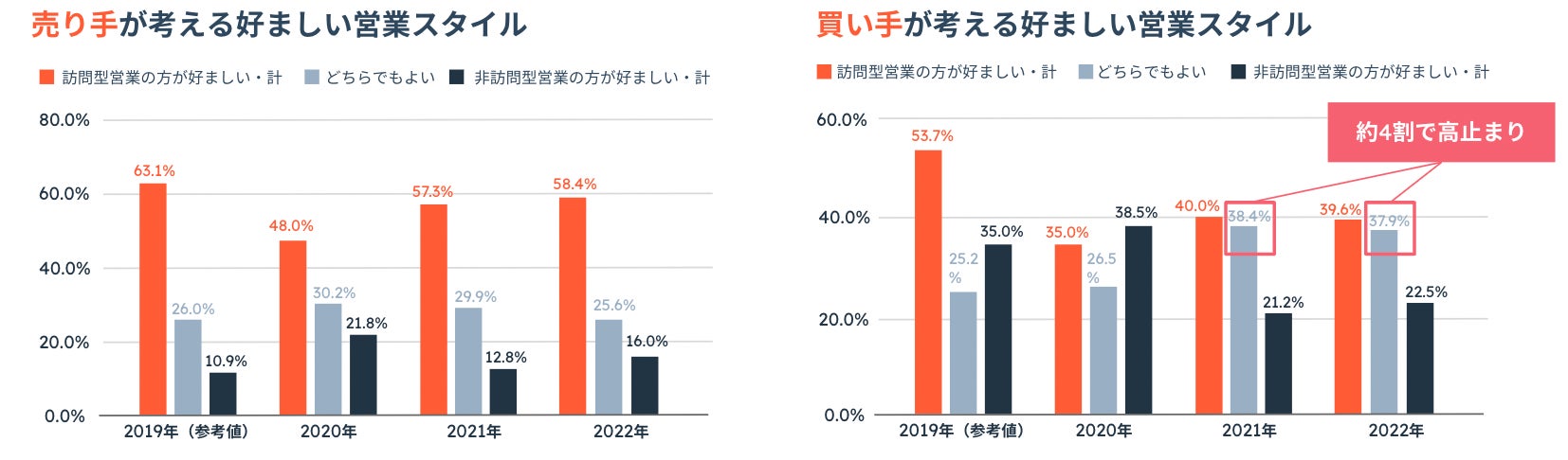 売り手側はコロナ禍以前の2019年から「訪問営業の方が好ましい」と考える人が最も多く、全体の傾向は4年間で大きく変わっていません。一方買い手側は、「どちらでもよい(状況に応じて柔軟に対応してほしい)」が前回調査以降約4割で高止まりし、今回の調査では前回調査とほとんど変化がありませんでした。2020年から2021年はコロナ禍により買い手の意識の変化が大きかったのに対し、2021年から2022年は認識が落ち着いたことがわかります。
